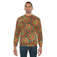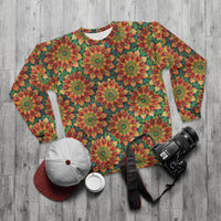 A vibrant all-over print sweatshirt that brings warm, botanical energy to your everyday wardrobe. Deep autumnal hues of orange, red, and green form layered mandala-style florals that feel both retro and handcrafted. The medium-weight polyester holds the intense, saturated colors while keeping the silhouette crisp: a classic crew neck with ribbed-knit collar and cuffs that stretch and rebound with wear. Wear it when you want your outfit to feel like a cozy, artful backdrop—on city walks through leafy neighborhoods, at casual creative meetups, or while sipping tea and sketching on a slow afternoon. The custom cut-and-sewn construction lets the pattern flow uninterrupted across seams, so the design reads as one continuous tapestry rather than disconnected panels.