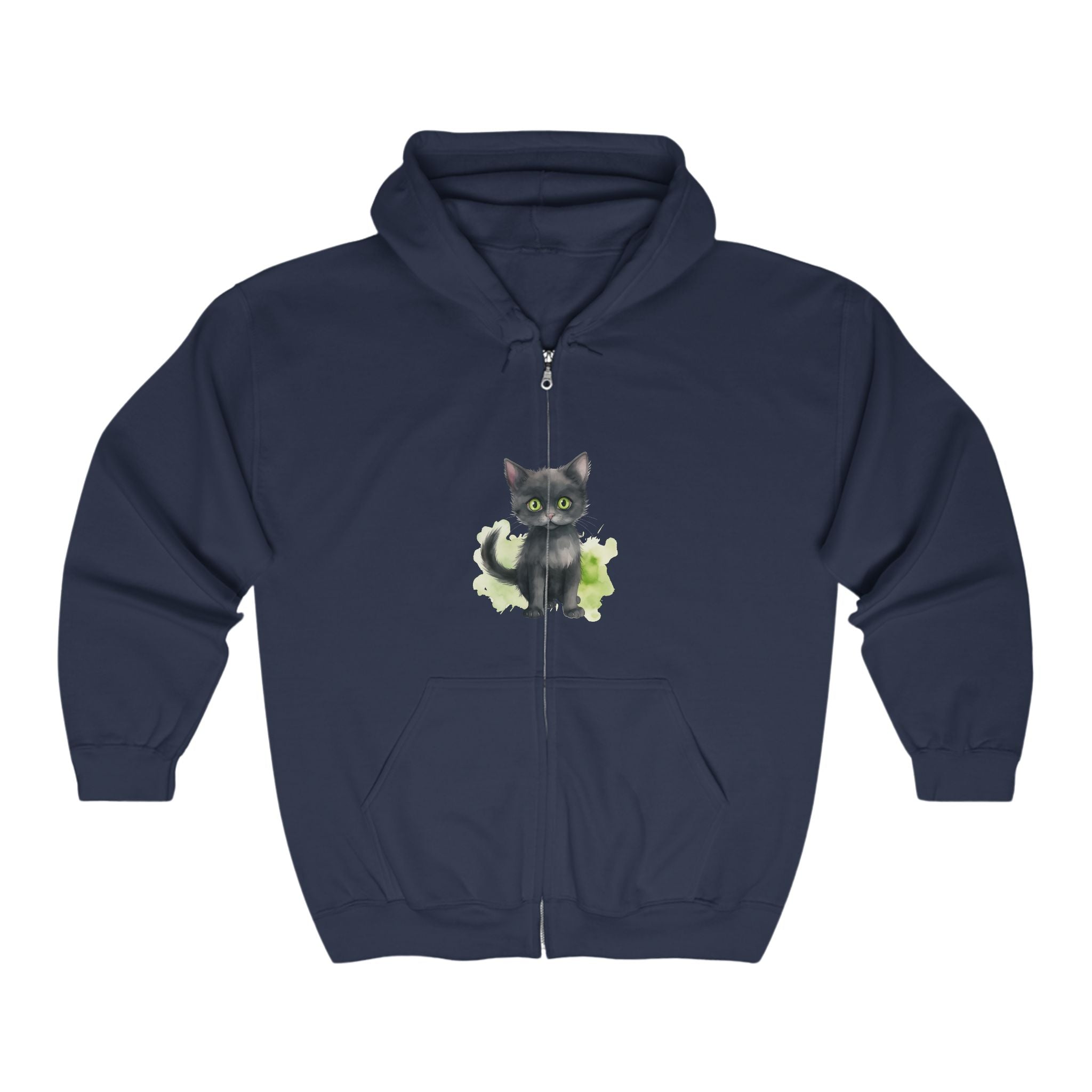 Wrapped in warmth and charm, this cozy hoodie showcases a striking black cat with vivid green eyes, poised against a soft watercolor backdrop. The delightful feline captures the heart, inviting smiles and admiration wherever you go. This piece is not just an article of clothing; it’s a whimsical expression of your love for cats, perfect for adding a touch of artistry to your everyday wear.