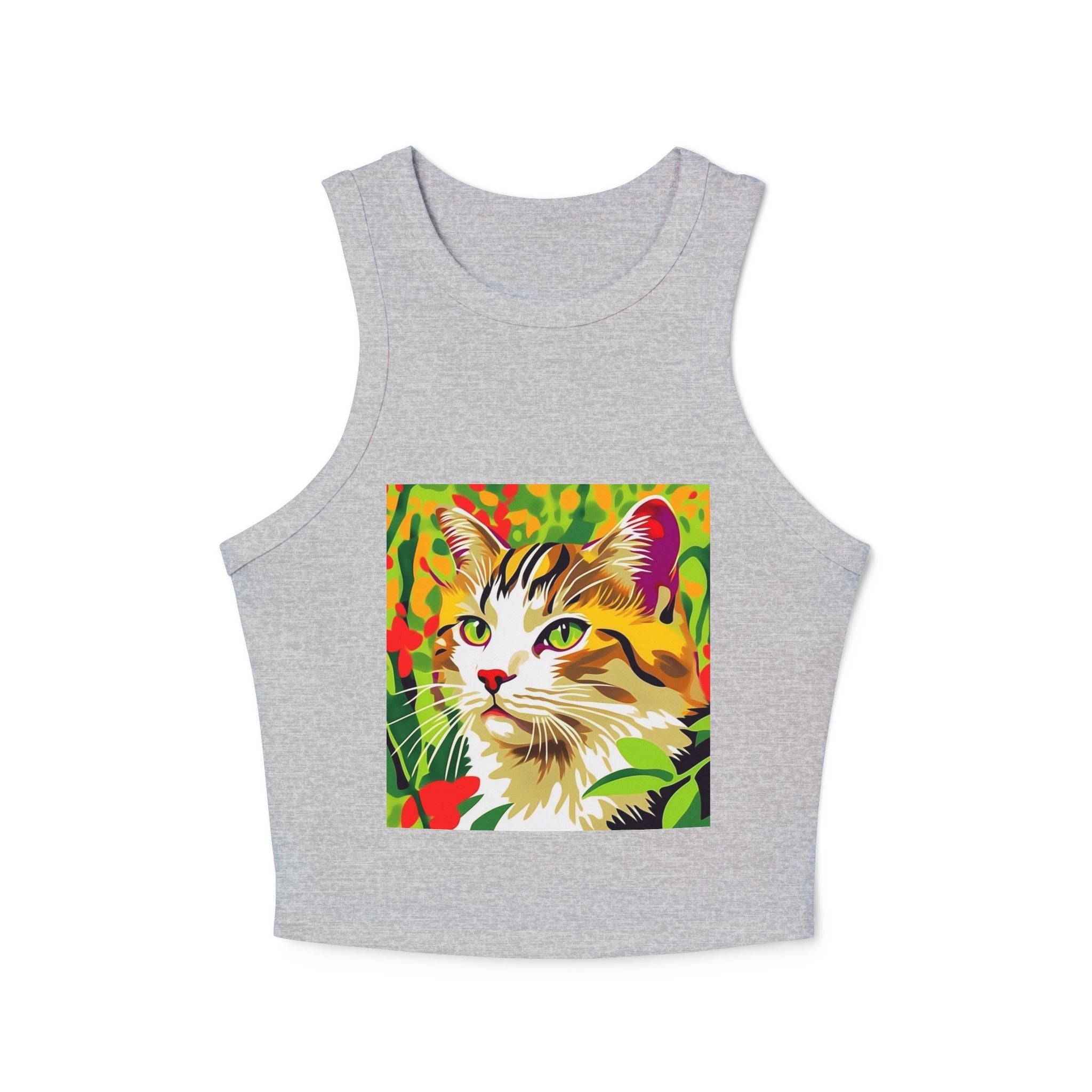 Step into a world of vibrant hues with this delightful tank top featuring an enchanting cat design. The playful illustration bursts with lively colors and dynamic outlines, capturing the essence of a curious savanna cat amidst a backdrop of lush greenery. This piece not only serves as clothing but as a canvas of joy, perfect for those who adore both art and feline charm.