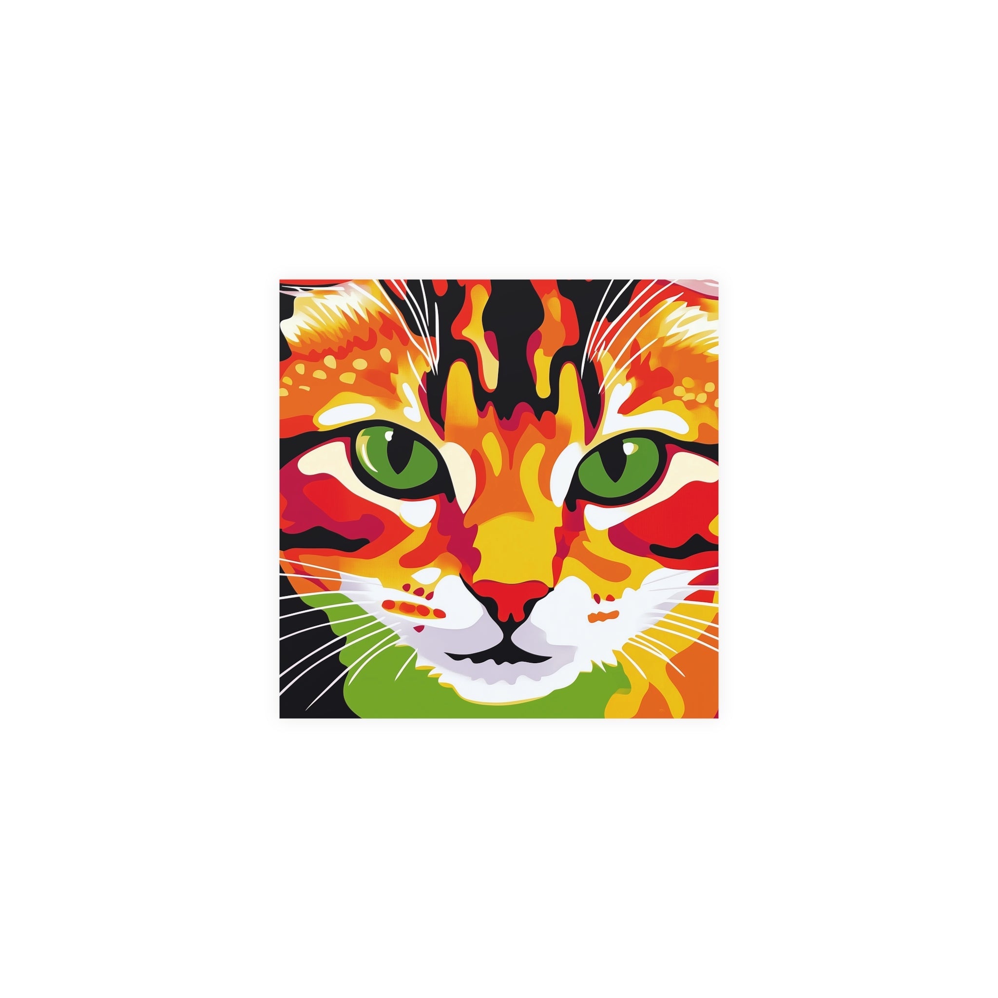 Experience the vibrant essence of feline charm with this captivating cat portrait poster. The striking illustration showcases a mesmerizing cat, adorned in a kaleidoscope of fiery oranges, radiant yellows, and deep blacks. This artwork radiates playfulness, inviting you to bask in its colorful spirit and bringing life into any space.