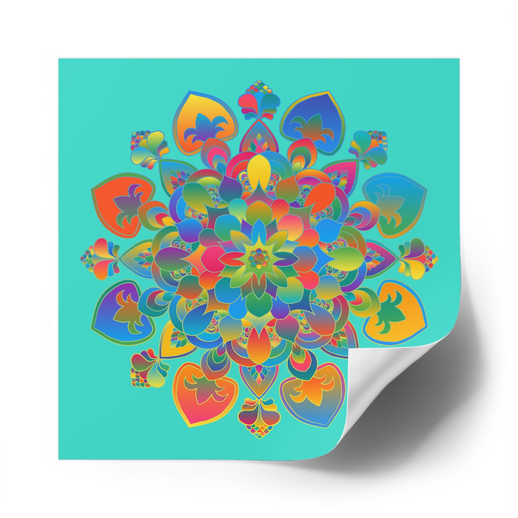 Elevate your style with these square laminate stickers featuring a stunning hand-drawn mandala in shades of gold, red, and green on a Turquoise background. Crafted from premium vinyl material and coated with a protective laminate, these stickers offer a vivid and long-lasting design. Water and scratch-resistant, they're perfect for decorating laptops, notebooks, kitchen, or any surface you want to personalize with elegance and durability.