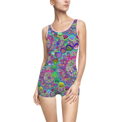This vibrant Swimsuit features a beautiful Mandala Art Design with vibrant color hues perfect for a day at the beach or pool. The boyshort bottoms allow for more activities in and out of the water. Made with 85% Polye...