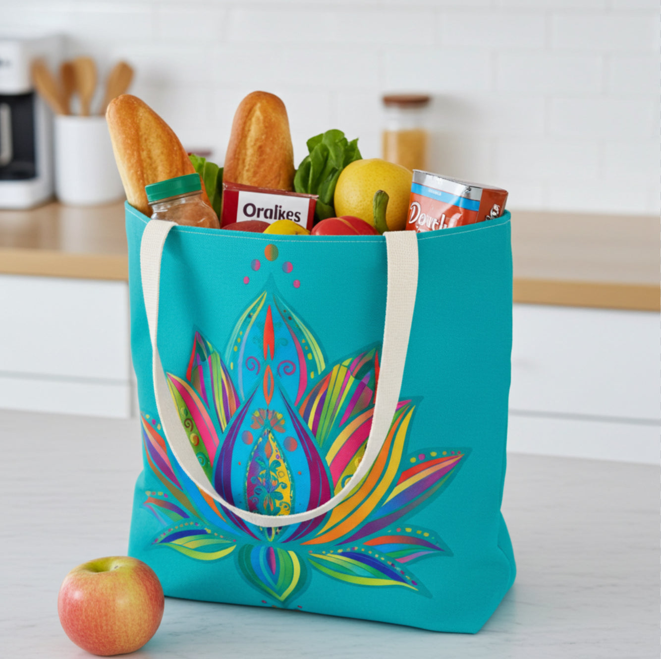 Bright and captivating, this vibrant azure tote bag features a stunning lotus flower design that radiates tranquility and joy in pop colors. The striking lotus design is vivid, eye-catching, and symbolic of serenity. Each glance at its intricate patterns can transport you to a serene oasis, making it perfect for any occasion—be it a yoga class, a day at the market or a casual outing with friends.