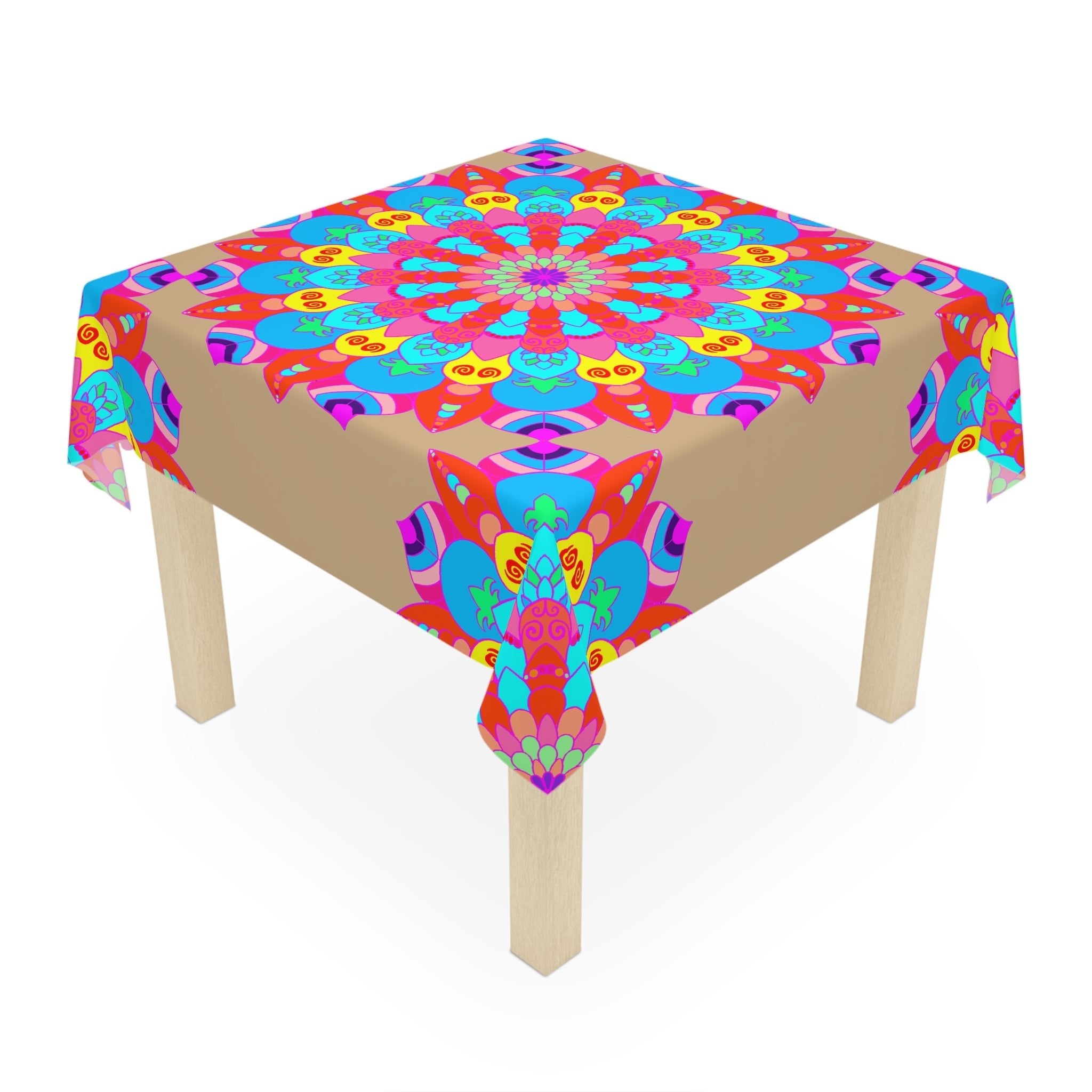 Mandala Tablecloth in Warm Sand with Playful Color Burst Design