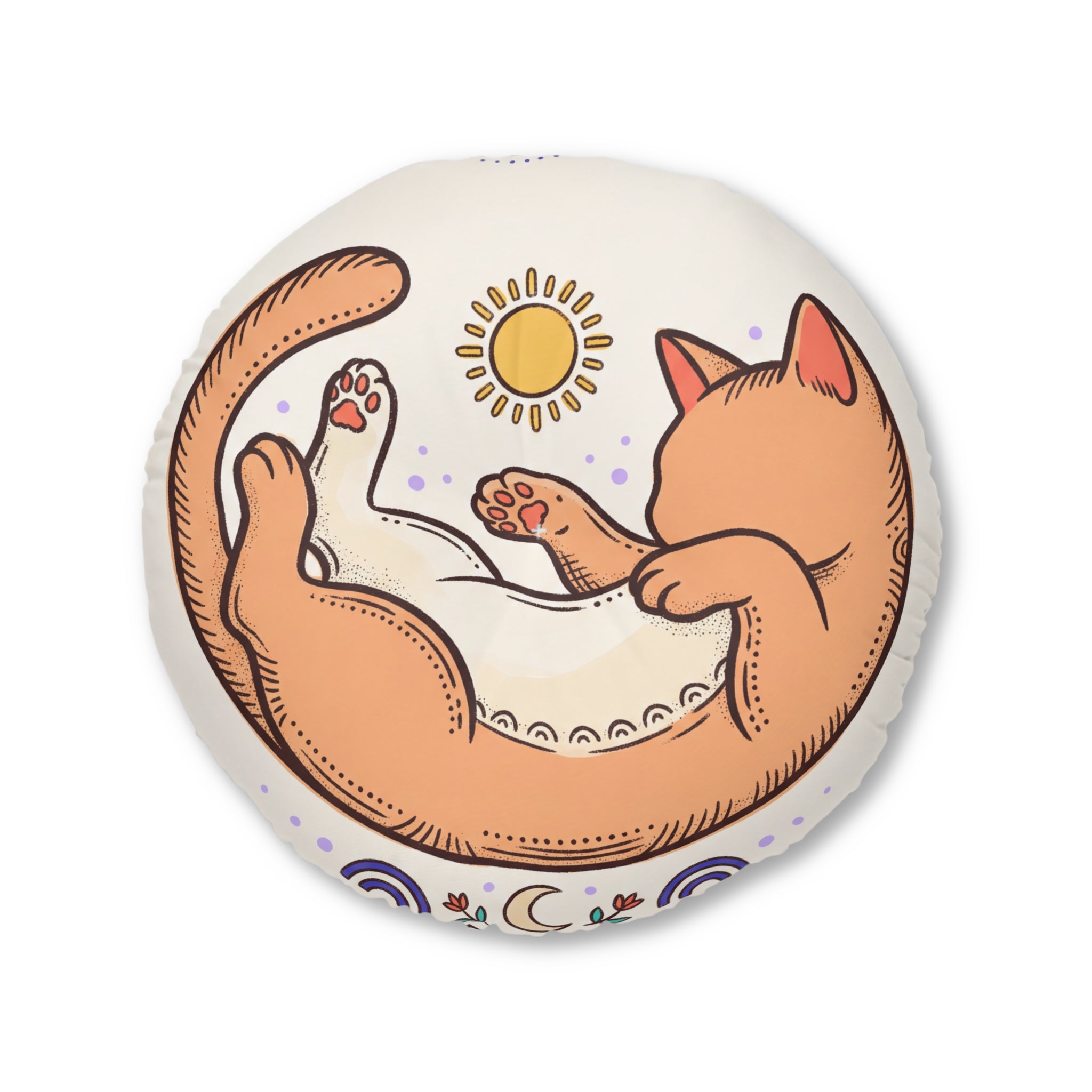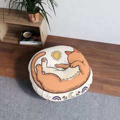 Placing this curled-cat floor pillow in the room instantly lifts the mood — it feels warm, playful, and welcoming. The bright, cheerful artwork becomes a joyful focal point that makes you smile from across the room; sinking into it invites relaxed lounging, reading sessions, or cozy floor conversations. The vivid colors and clear silhouette give a confident pop to any corner while the soft, inviting surface makes it easy to curl up and stay awhile.