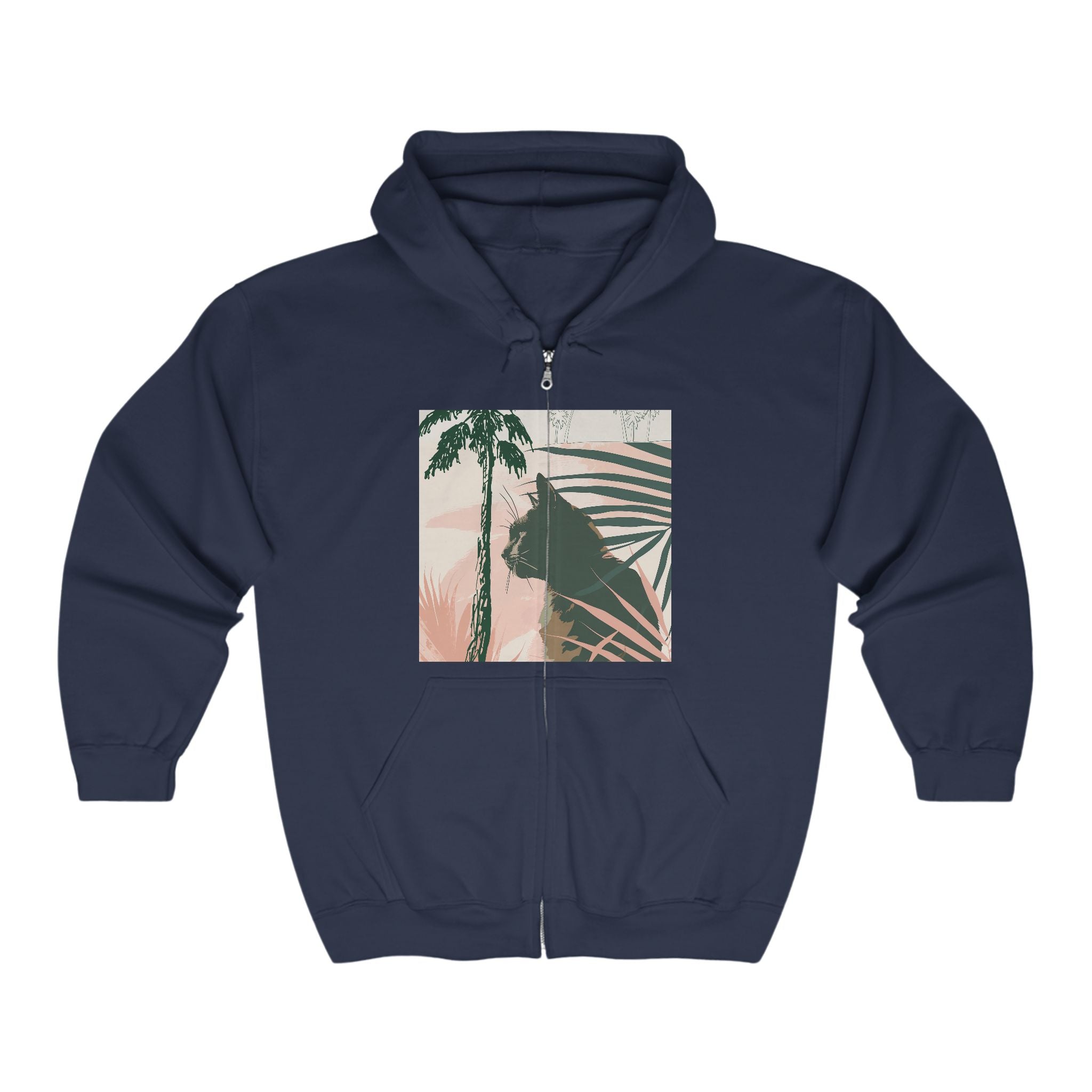 Step into a world where the allure of the jungle meets the playful spirit of a sleek black cat. This striking hoodie showcases an enchanting design that effortlessly blends vibrant palm leaves with the silhouette of our mysterious feline friend. It’s not just clothing; it’s a bold expression of your love for nature and all things whimsical.