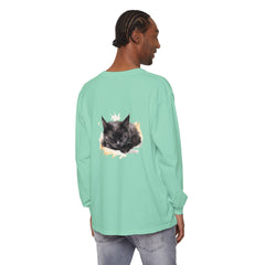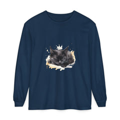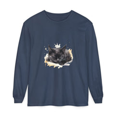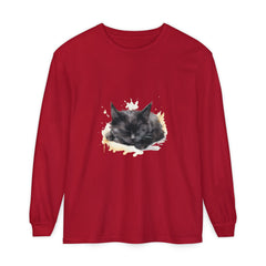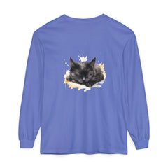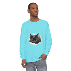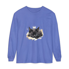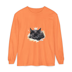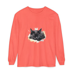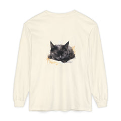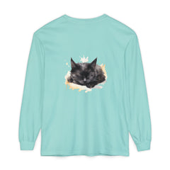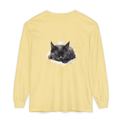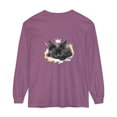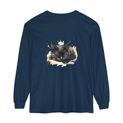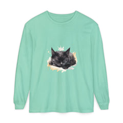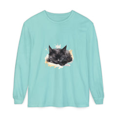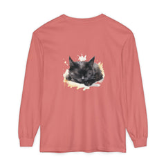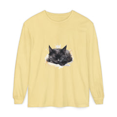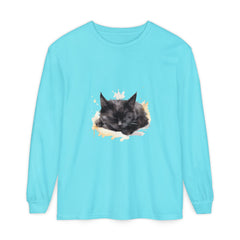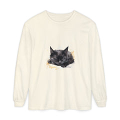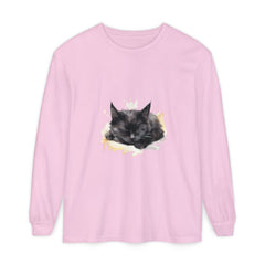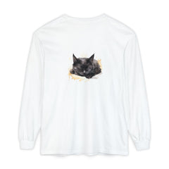 This comfy unisex long sleeve tee features a charming watercolor illustration of a black cat taking a nap in a puddle of sunshine. A perfect gift for cat lovers who appreciate whimsical and artistic designs.