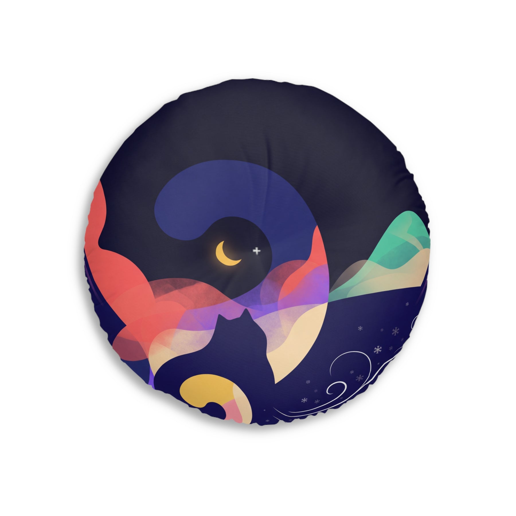 Close-up of a round tufted cat floor pillow in deep blue (#1B1464) and warm accent colors featuring a midwinter cozy cat nap design; lifestyle setting with soft lighting, showcasing vibrant, high-contrast cat motif and cozy textures
