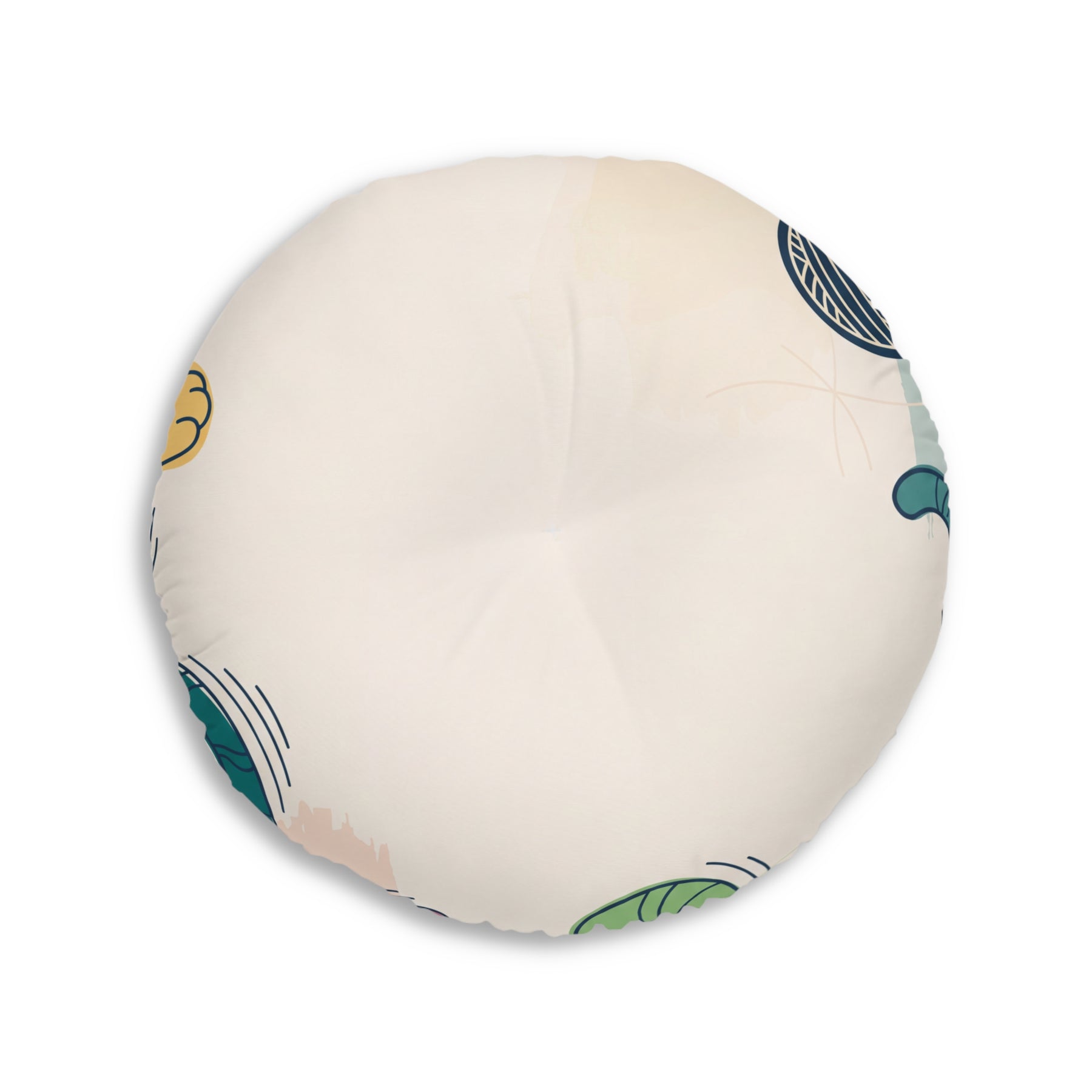 Round cat floor pillow in warm orange-beige hues (#F59E6B) with boho line-art design; cozy, purring motif; lifestyle setting showing a comfy corner for reading or tea. Product is a tufted cushion with vibrant colors and hand-drawn contours.