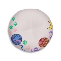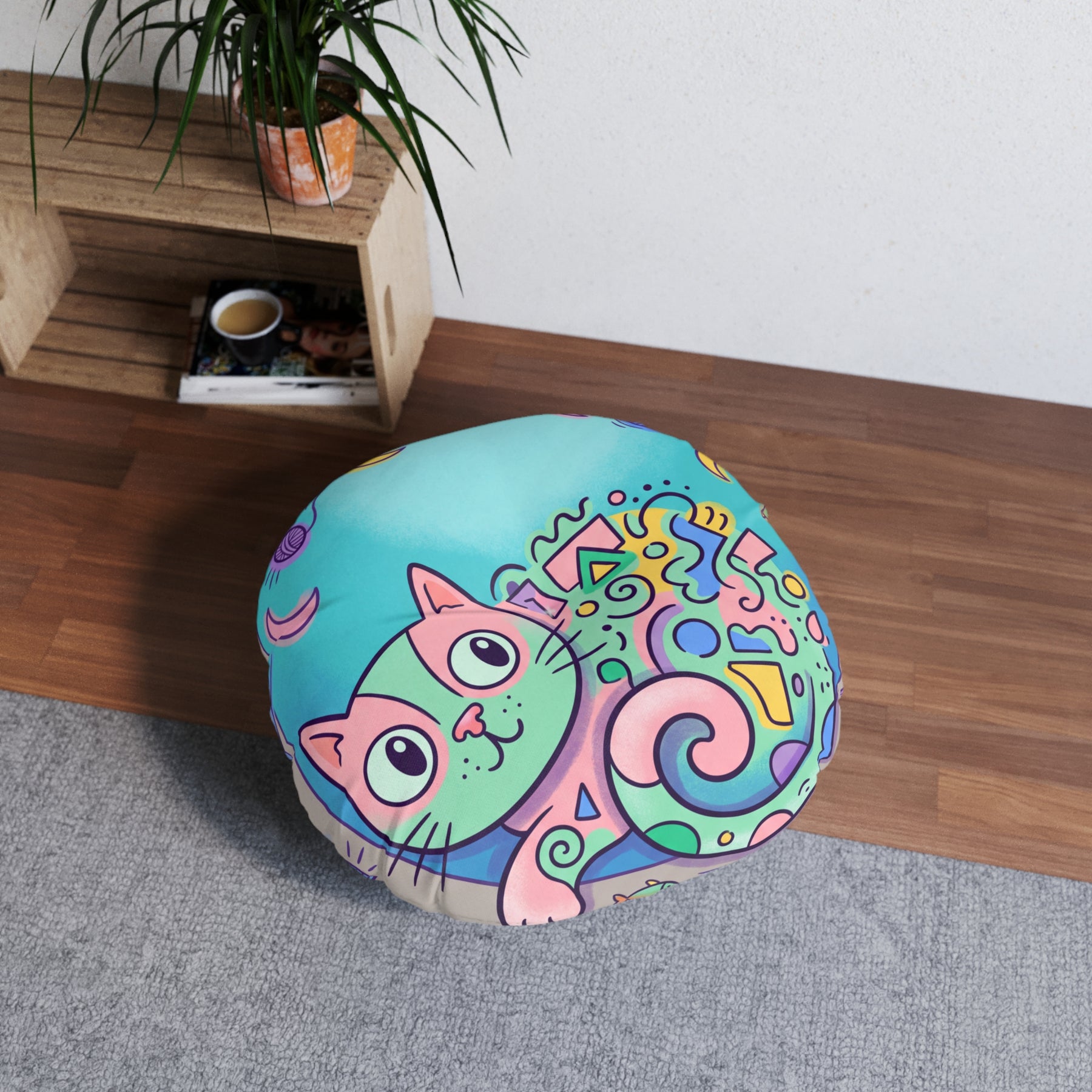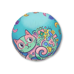 Placing this round cat floor pillow in a room instantly lifts the mood with playful warmth and a touch of gentle surrealism. Sitting or lounging on it invites slow, silly naps and quiet smiles; the calligraphic phrase makes guests chuckle and becomes a small ritual. Bright colors and a dreamy composition make the corner feel cozier and more joyful every time you sink into it.