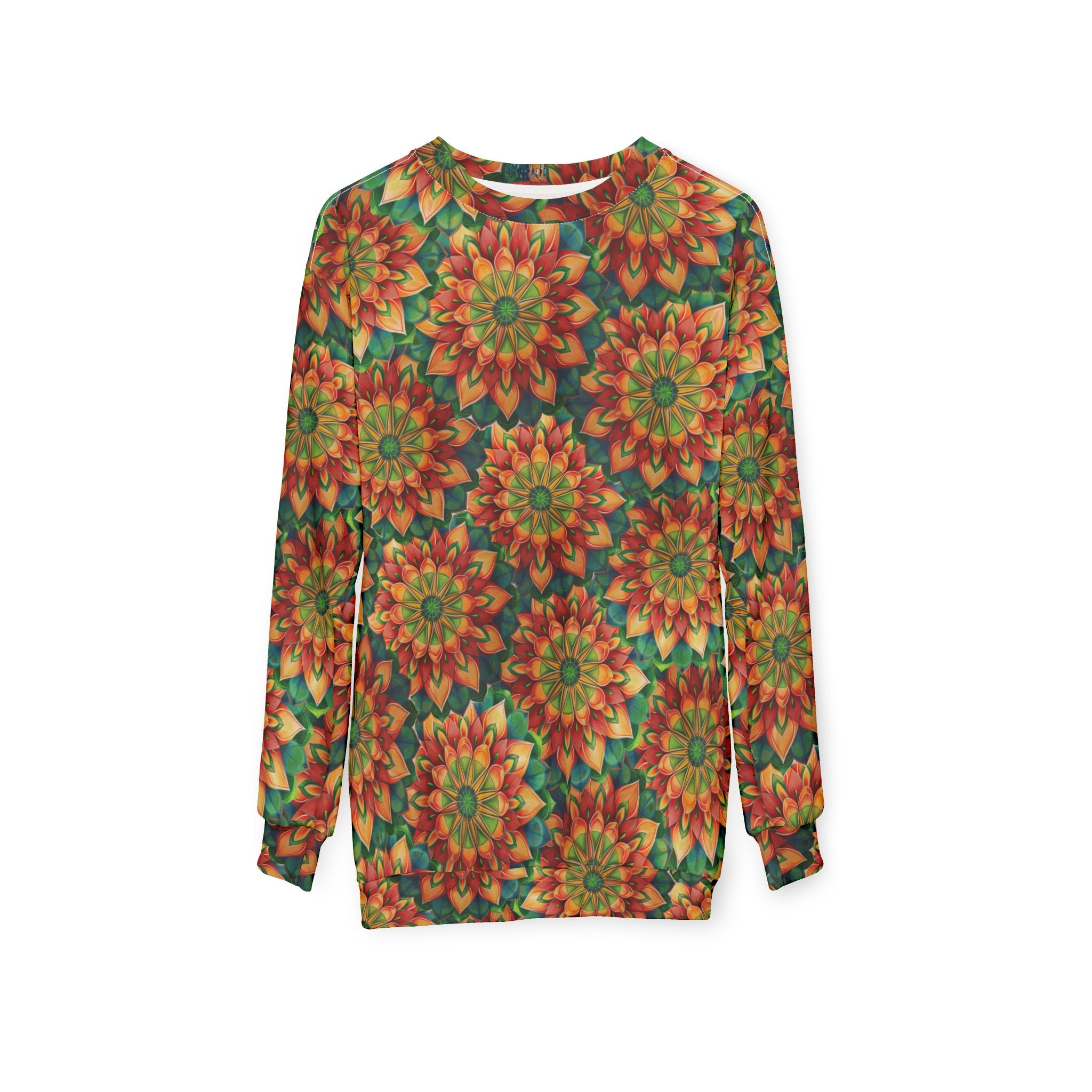 A vibrant all-over print sweatshirt that brings warm, botanical energy to your everyday wardrobe. Deep autumnal hues of orange, red, and green form layered mandala-style florals that feel both retro and handcrafted. The medium-weight polyester holds the intense, saturated colors while keeping the silhouette crisp: a classic crew neck with ribbed-knit collar and cuffs that stretch and rebound with wear. Wear it when you want your outfit to feel like a cozy, artful backdrop—on city walks through leafy neighborhoods, at casual creative meetups, or while sipping tea and sketching on a slow afternoon. The custom cut-and-sewn construction lets the pattern flow uninterrupted across seams, so the design reads as one continuous tapestry rather than disconnected panels.
