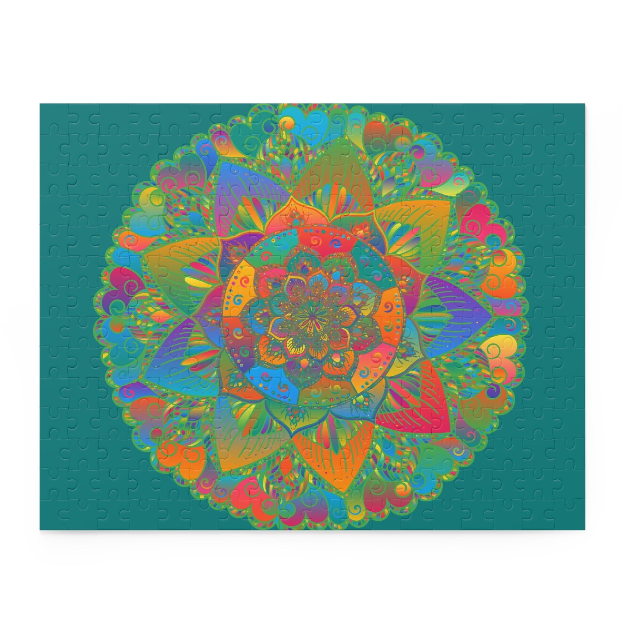 Immerse yourself in a captivating kaleidoscope of colors with this mesmerizing mandala puzzle. The intricate design bursts with psychedelic hues, showcasing a harmonious blend of geometric shapes and organic forms that dance across a rich petroleum green background. Each piece is a gateway into a vibrant world where creativity and mindfulness thrive, inviting you to lose yourself in its beauty.