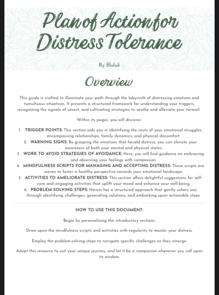 8 pages PDF file, instant download, "Plan of action for Distress Tolerance".