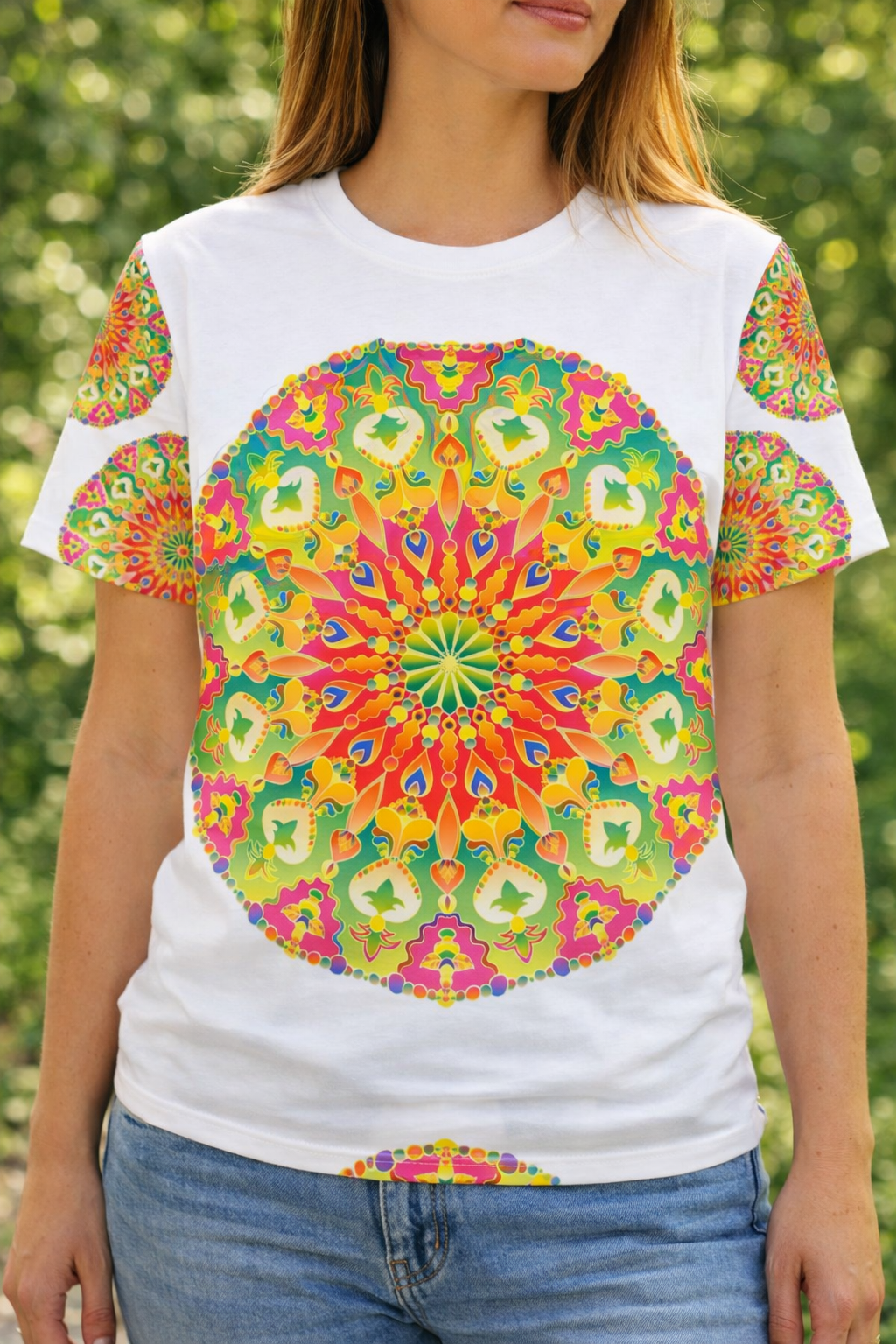 Radiant Floral Mandala Women's T-Shirt in Bright Rainbow Hues