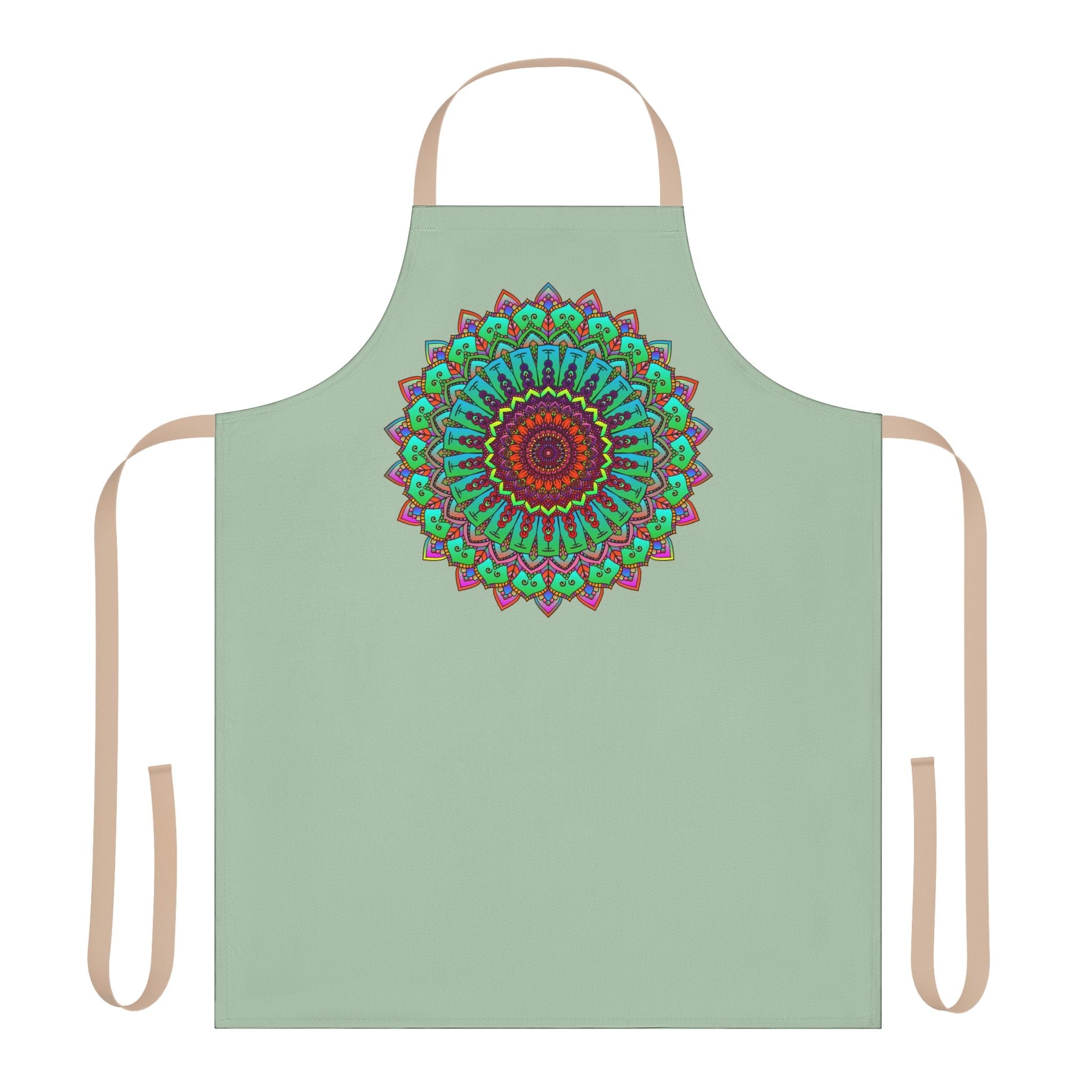 Elevate your culinary adventures with this enchanting apron, adorned with a mesmerizing mandala design in a tranquil sage green. This captivating artwork radiates harmony and creativity, transforming every cooking session into a vibrant experience. The intricate details and rich colors inspire a sense of peace, making it a stunning centerpiece in any kitchen.