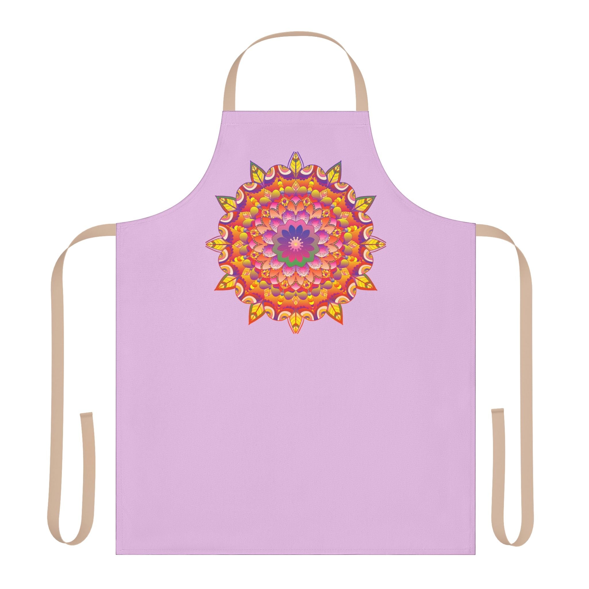 Embrace the vibrant allure of the lilac mandala floral apron, a stunning masterpiece that transforms your kitchen into a canvas of creativity. Featuring an intricate mandala design bursting with hues of orange, purple, and yellow, this apron radiates warmth and artistic flair, inviting you to explore your culinary passions with joy and style.