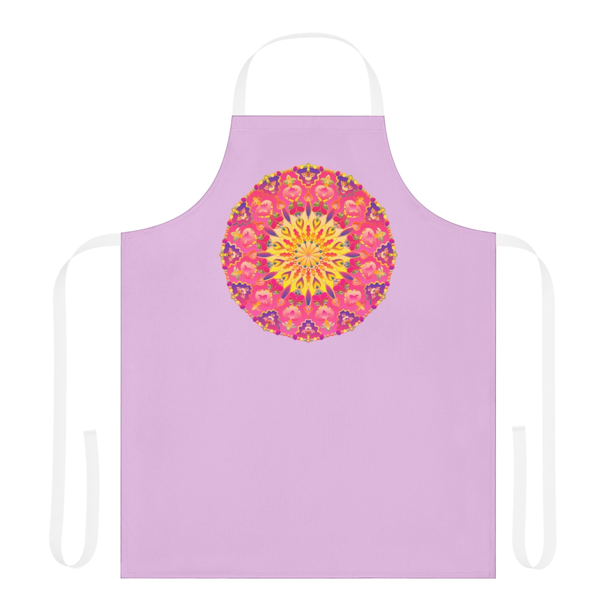 Radiating a sense of creativity and tranquility, this exquisite kitchen apron features a captivating lilac mandala design that enchants with its intricate patterns and vibrant hues. Each detail tells a story of artistry, transforming your culinary space into a canvas of inspiration. Its rich blend of pinks and yellows dances harmoniously against a soft lilac backdrop, inviting you into a world where cooking becomes an art form.