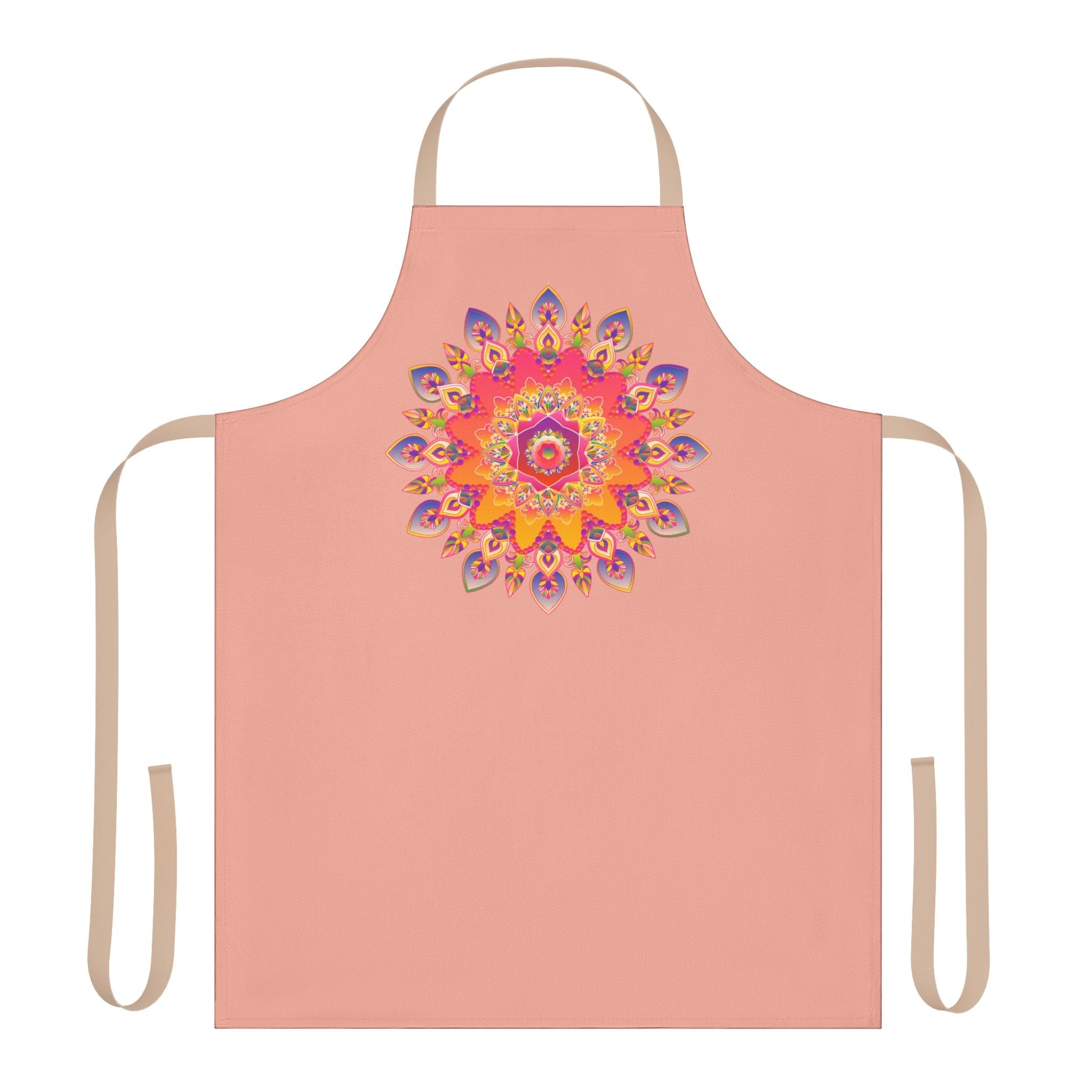 Embrace the enchanting allure of vibrant hues and intricate mandala designs with this captivating apron. Adorned with a stunning mandala artwork, bursting with shades of apricot, pink, and orange, it brings a joyous, bohemian spirit to your kitchen adventures. Each detail tells a story, inviting creativity and inspiration into your cooking and crafting spaces.