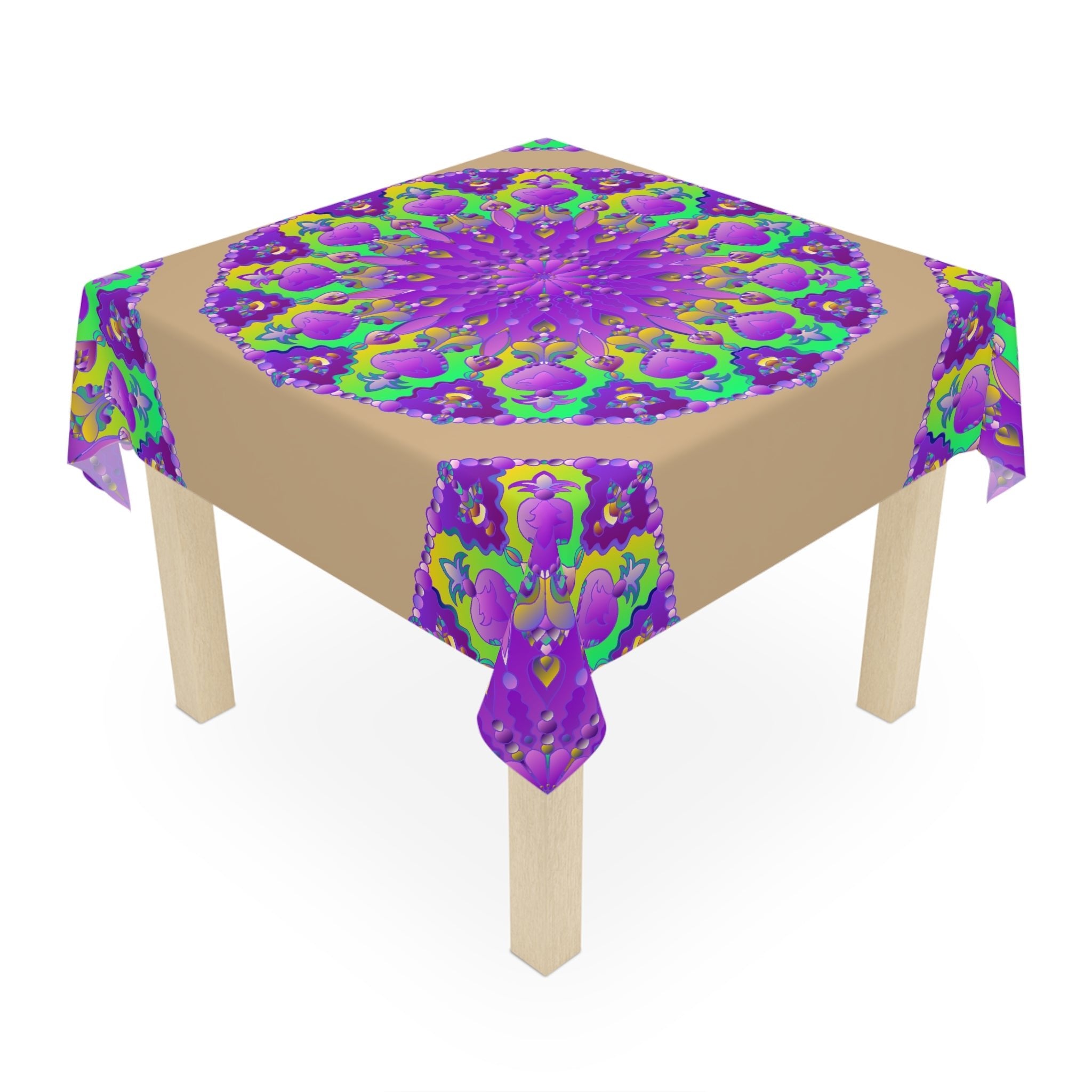 Transform your dining experience with a captivating mandala design, bursting with vibrant purples and greens that create an enchanting atmosphere. This stunning tablecloth not only serves a practical purpose but also unveils a world of creativity and mindfulness, inviting warmth and joy into your home. Each detail of the intricate mandala pattern tells a story, making your table the heart of lively gatherings.