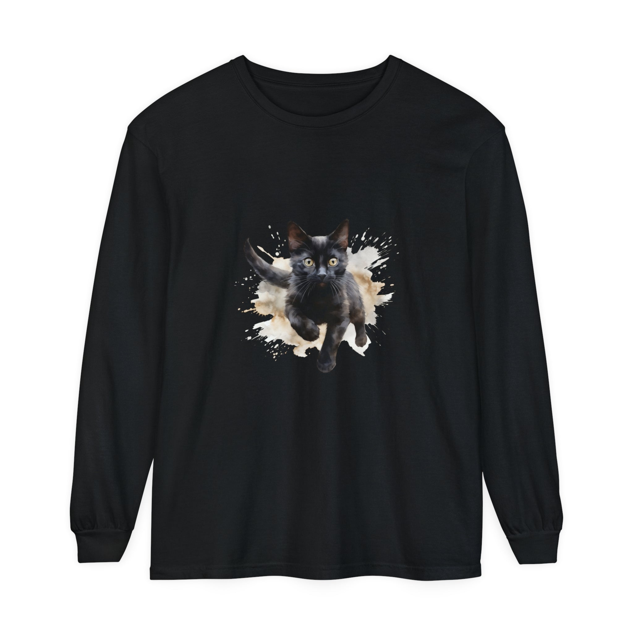 Unleash your whimsical side with this enchanting long-sleeve tee, featuring a spirited watercolor splash design of a curious black cat. With its striking yellow eyes and playful stance, this feline artwork captivates the imagination, inviting you to embrace your playful spirit while showcasing your love for all things feline. The vibrant colors and artistic flair transform this shirt into not just clothing, but a canvas of creativity.