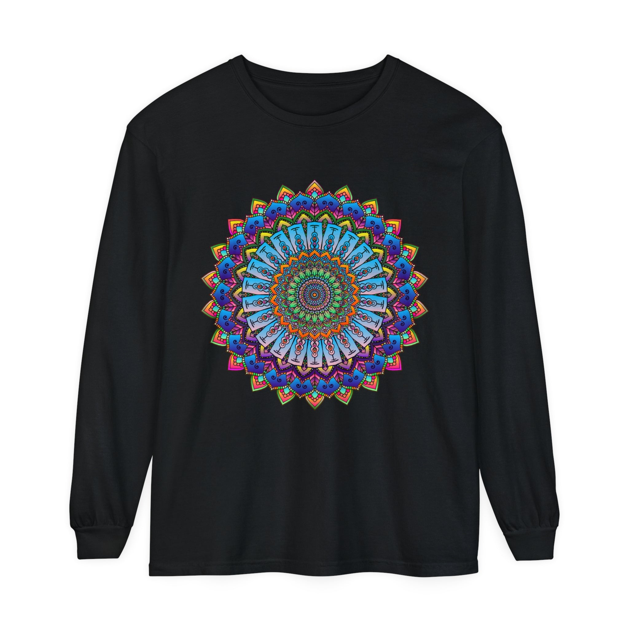 Be captivated by the vibrant burst of color and intricate patterns showcased in this stunning long sleeve tee featuring an enchanting mandala design. Each detail of this magnificent artwork brings forth a sense of tranquility and joy, reflecting a radiant and mindful lifestyle. Perfect for those who embrace art and creativity, this shirt serves not just as a piece of clothing but a vibrant expression of your spirit.