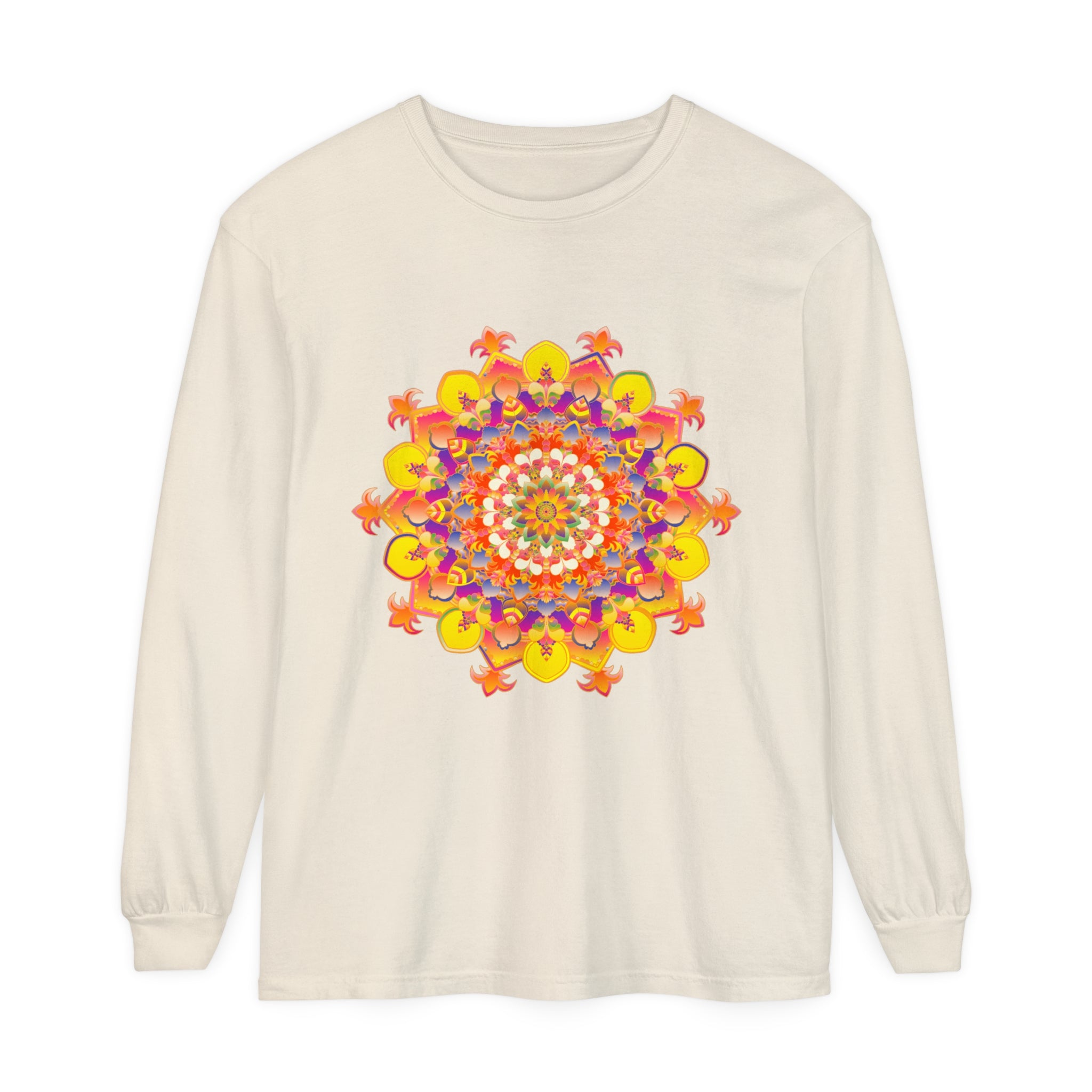 Experience the vibrant energy of intricate mandala art captured in a stunning long sleeve tee. The bold, swirling patterns in sunny hues evoke a sense of joy and tranquility, making this piece a dazzling addition to your wardrobe. It's not just a garment; it’s a celebration of creativity and color that invites you to express your individuality.
