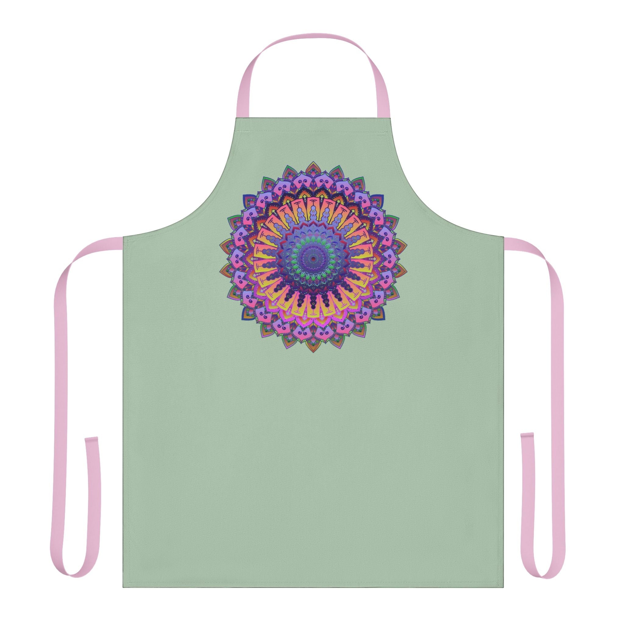 Experience the enchanting allure of intricate mandala artistry with this beautifully designed apron. The striking sage green backdrop is adorned with a mesmerizing mandala illustration, intricately crafted to captivate the senses. Each curved line and vibrant color reflects a journey through creativity, transforming your cooking space into a canvas of inspiration.