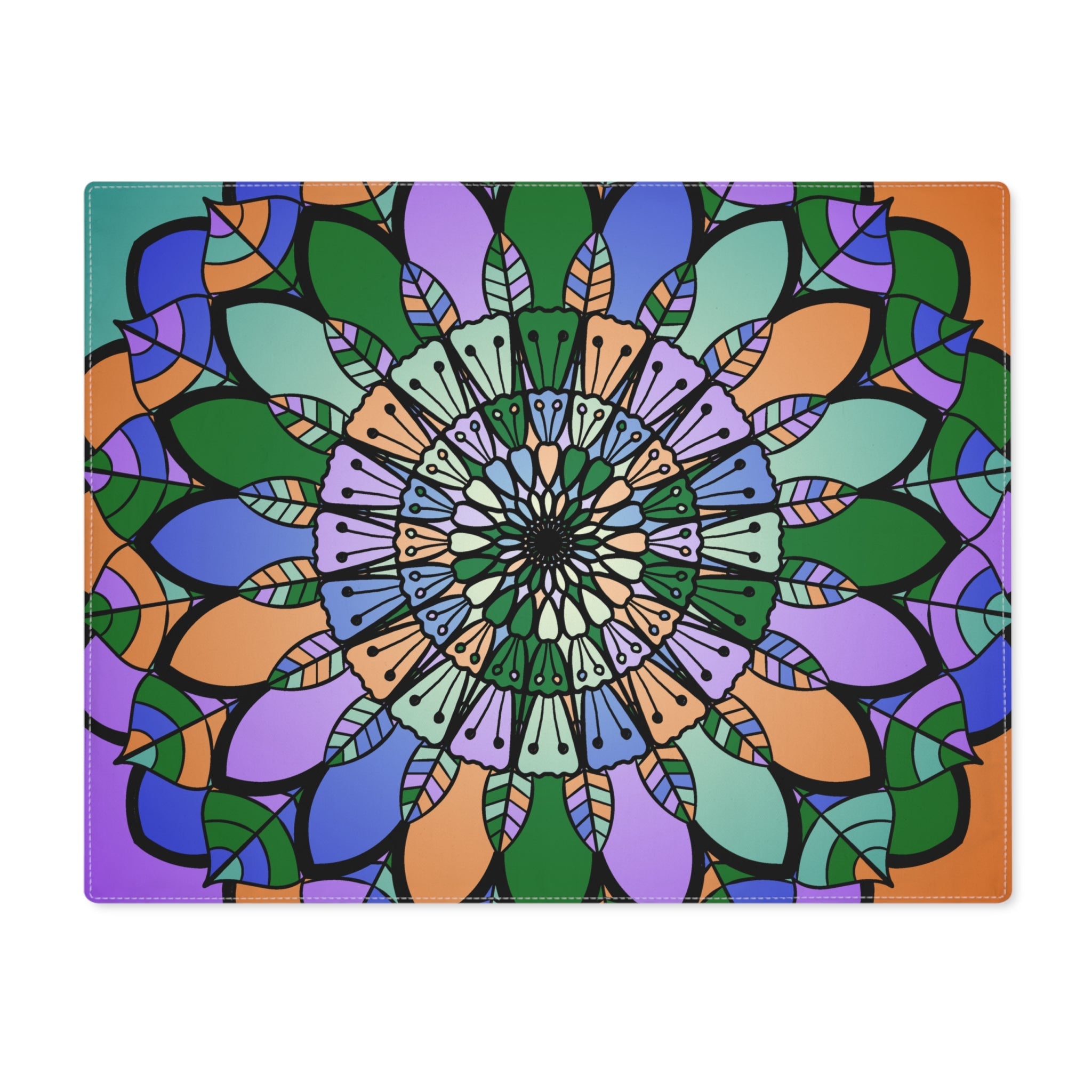 Unveil a vibrant tapestry of tranquility with this stunning mandala placemat, where intricate patterns swirl in shades of green, orange, and purple. Each unique design tells a story, wrapping your dining experience in a kaleidoscope of color that inspires creativity and mindfulness at every meal.