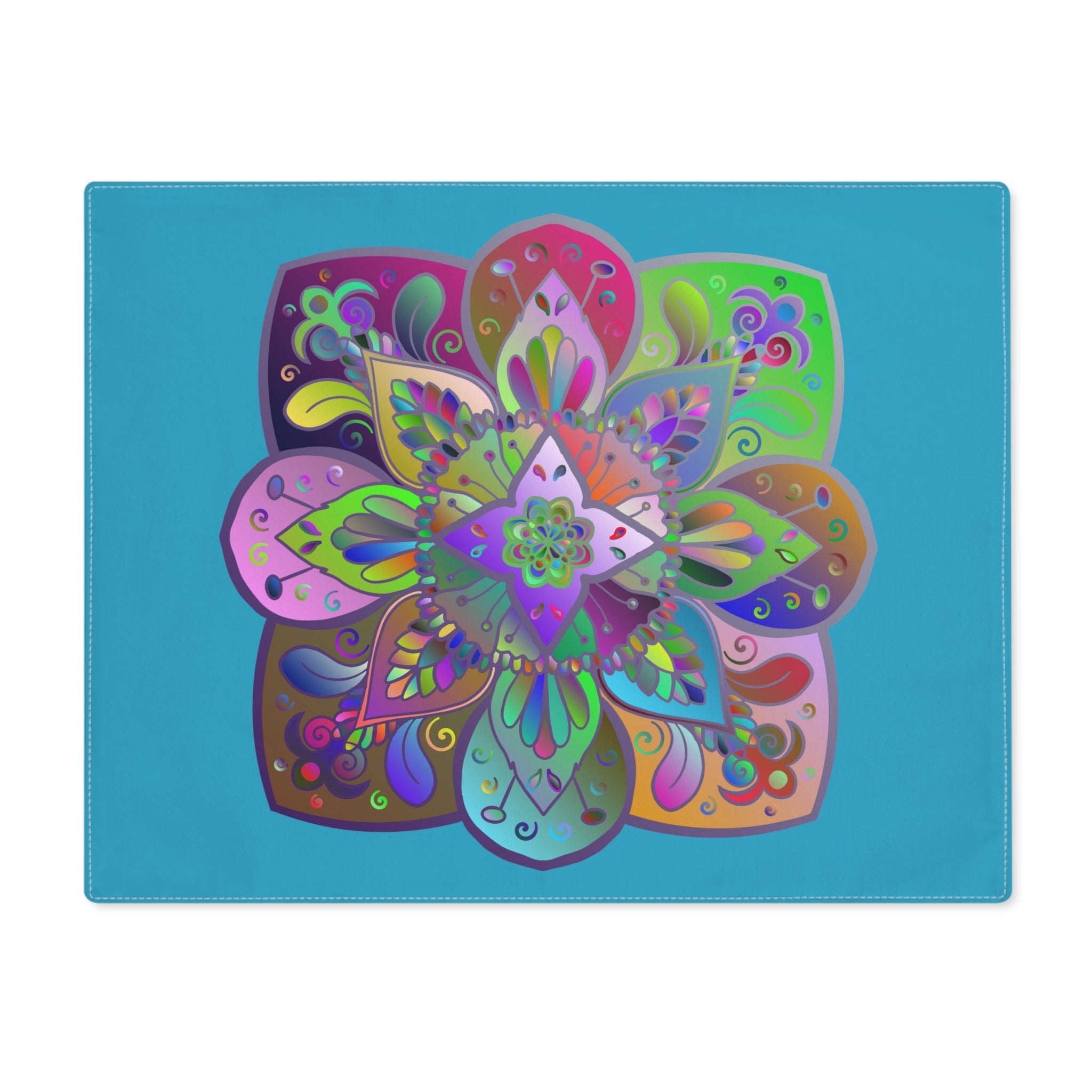 Bright and mesmerizing, this turquoise mandala art placemat serves as a stunning centerpiece that invites joy to every meal. The intricate floral design, bursting with vibrant hues, captures the essence of creativity and mindfulness, transforming your dining experience into an artistic celebration. Each glance reveals delicate petals and swirling patterns, making your table feel like a canvas of inspiration.