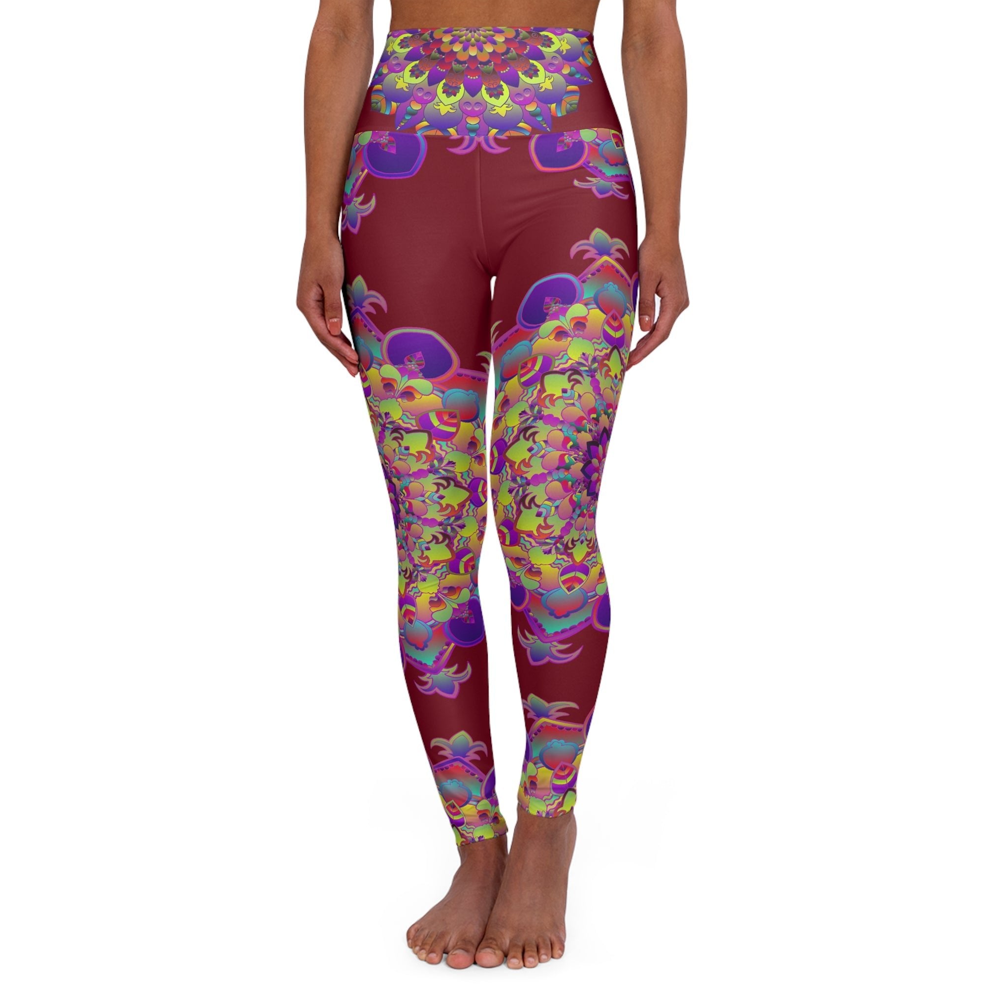 Step into a realm of vibrant expression with these captivating yoga leggings adorned with an exquisite mandala pattern. The deep burgundy backdrop beautifully cradles intricate designs, bursting with colors that dance across the fabric. Each detail tells a story, evoking feelings of tranquility and inspiration that accompany every movement, whether on the mat or enjoying a casual day out.