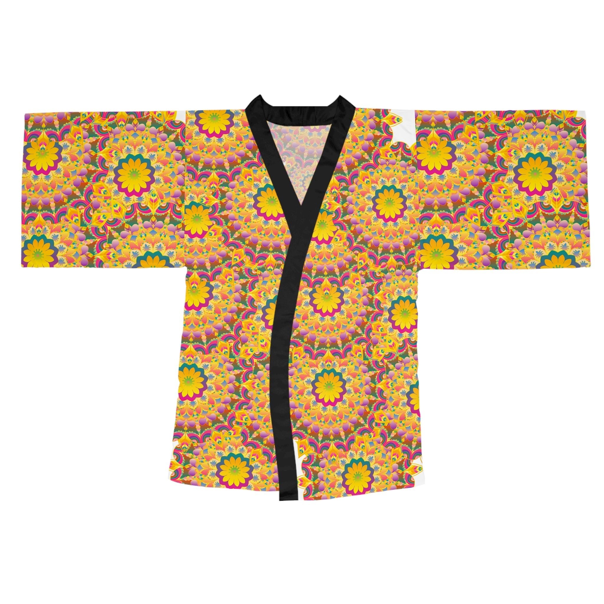Wrap yourself in a vibrant tapestry of floral artistry that bursts with life and color. This stunning kimono robe features an intricate mandala design, weaving together hues of bright yellow and pink that dance harmoniously across the fabric. Each glance invites a feeling of joy and serenity, allowing you to embody a bohemian spirit every day.