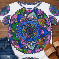 Experience the mesmerizing allure of vibrant mandalas bursting with rich blues and luscious greens. This stunning t-shirt showcases intricate patterns that dance across the fabric, resonating with creativity and serenity. Each detail breathes life into your wardrobe, making it a perfect expression of your colorful, bohemian spirit.