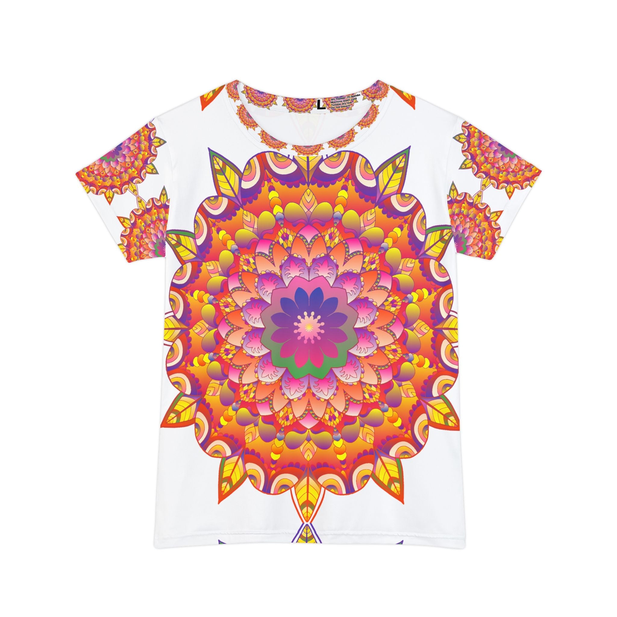 Embrace the enchanting allure of a vibrant mandala, beautifully crafted in radiant sunset hues that dance across this stunning t-shirt. The intricate floral patterns evoke a sense of peace and connection to the universe, transforming a simple garment into a wearable masterpiece. Perfect for yoga sessions or casual outings, this piece radiates positivity and joy, inviting you to celebrate your unique spirit.