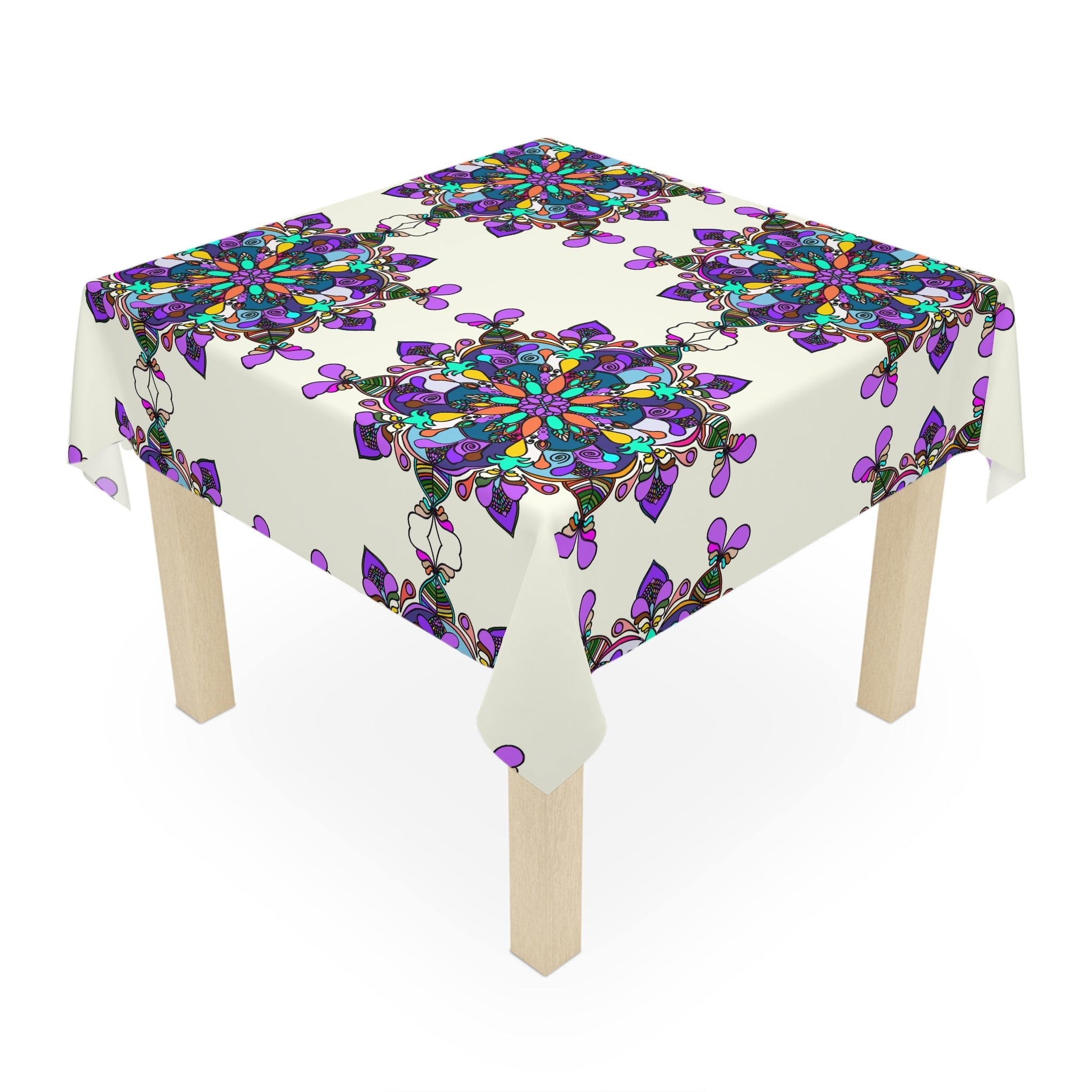 Be captivated by the vibrant dance of color and intricate patterns embodied in this stunning tablecloth, adorned with mesmerizing mandala art. The lively hues of purple, blue, and orange swirl together, invoking a sense of calm and creativity, transforming your dining space into a sanctuary of style and mindfulness.
