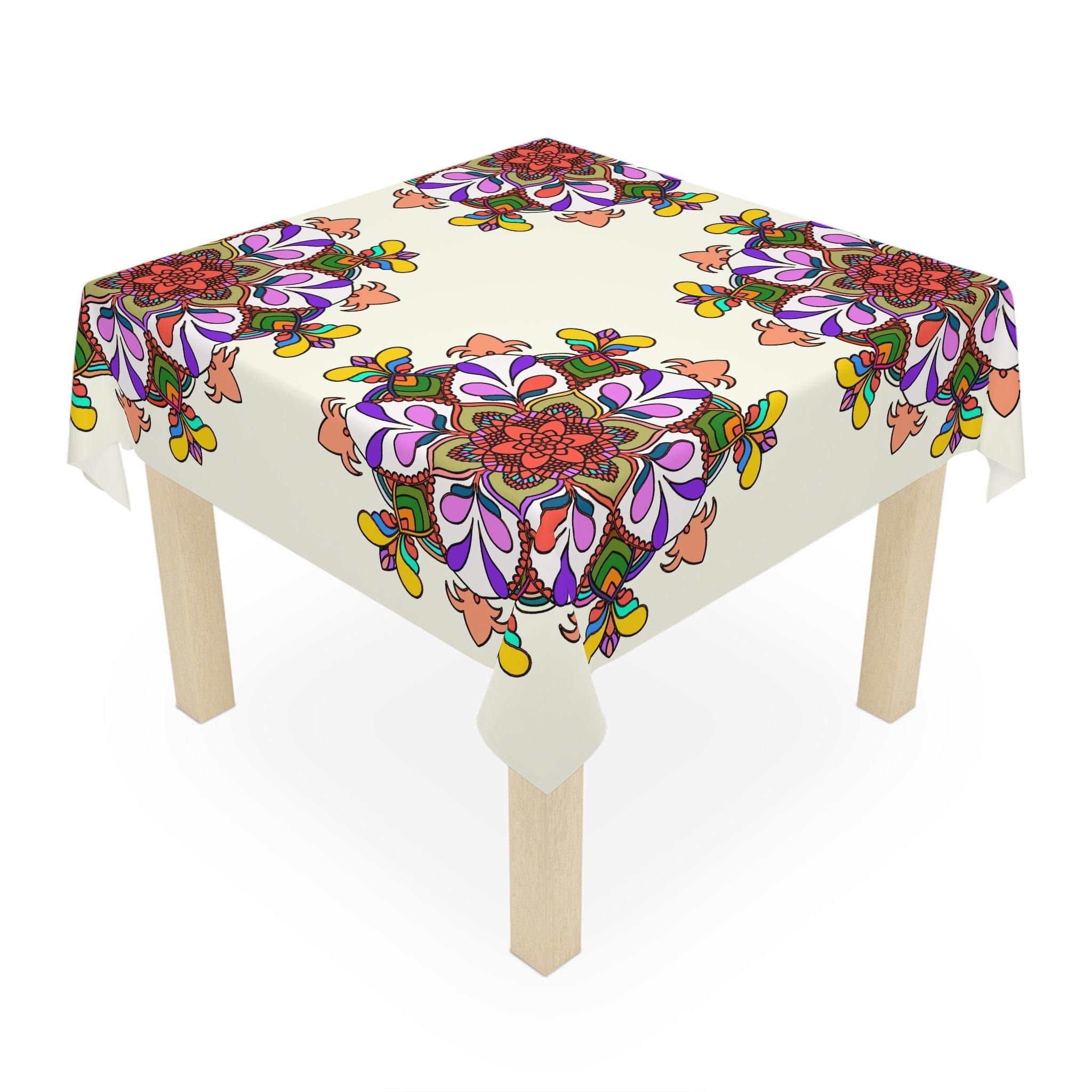 Indulge your senses with a captivating blend of artistry and elegance. This stunning tablecloth, adorned with intricate mandala designs, transforms your dining space into a sanctuary of tranquility and beauty. Vivid hues of purple, pink, and green dance across a serene ivory backdrop, inviting warmth and creativity to every meal. Let each gathering become a celebration of mindful living.