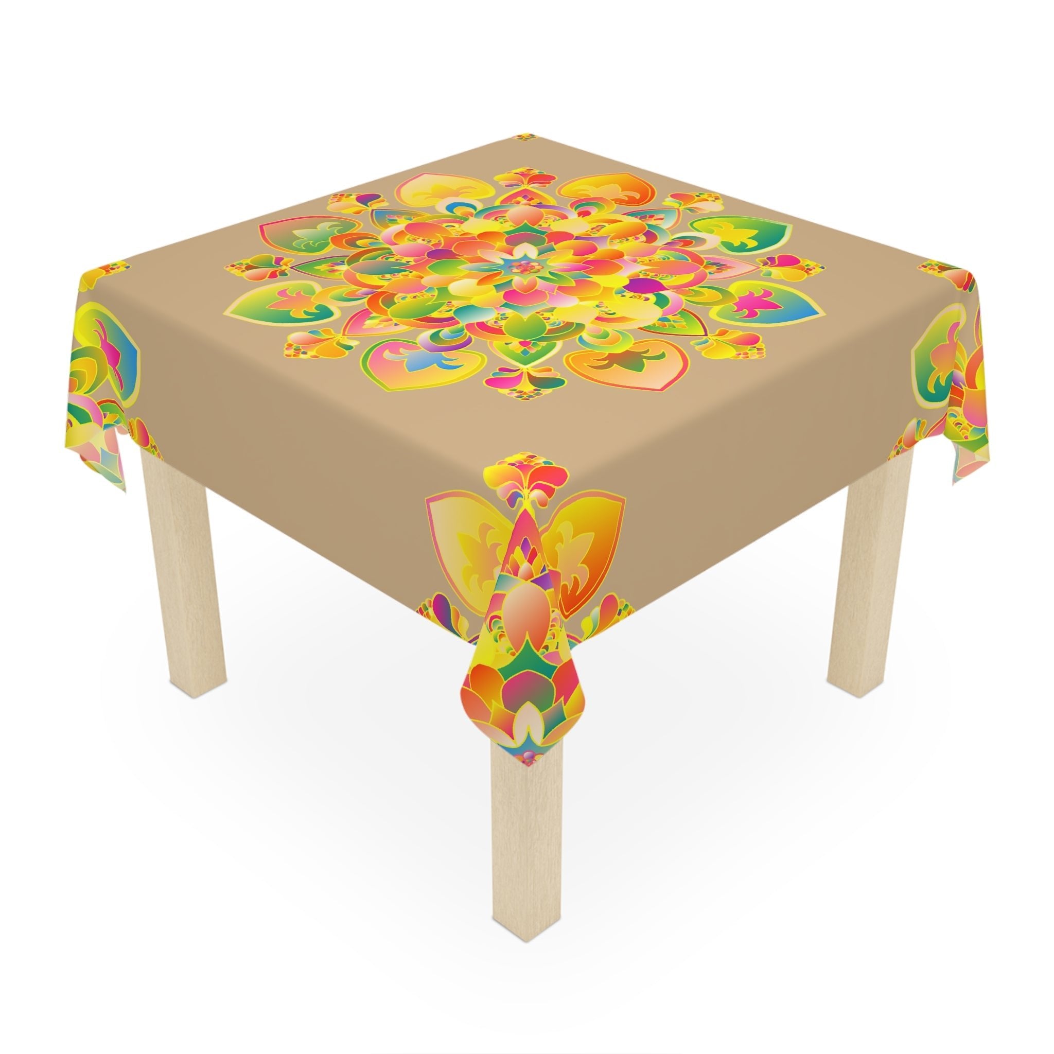 Transform your dining experience with a captivating tapestry of color and intricate patterns. This stunning tablecloth showcases a vibrant mandala design, bursting with lively floral elements that exude warmth and joy. The soft sand backdrop beautifully highlights the rich hues, creating a harmonious balance that invites mindfulness and creativity into your dining space.