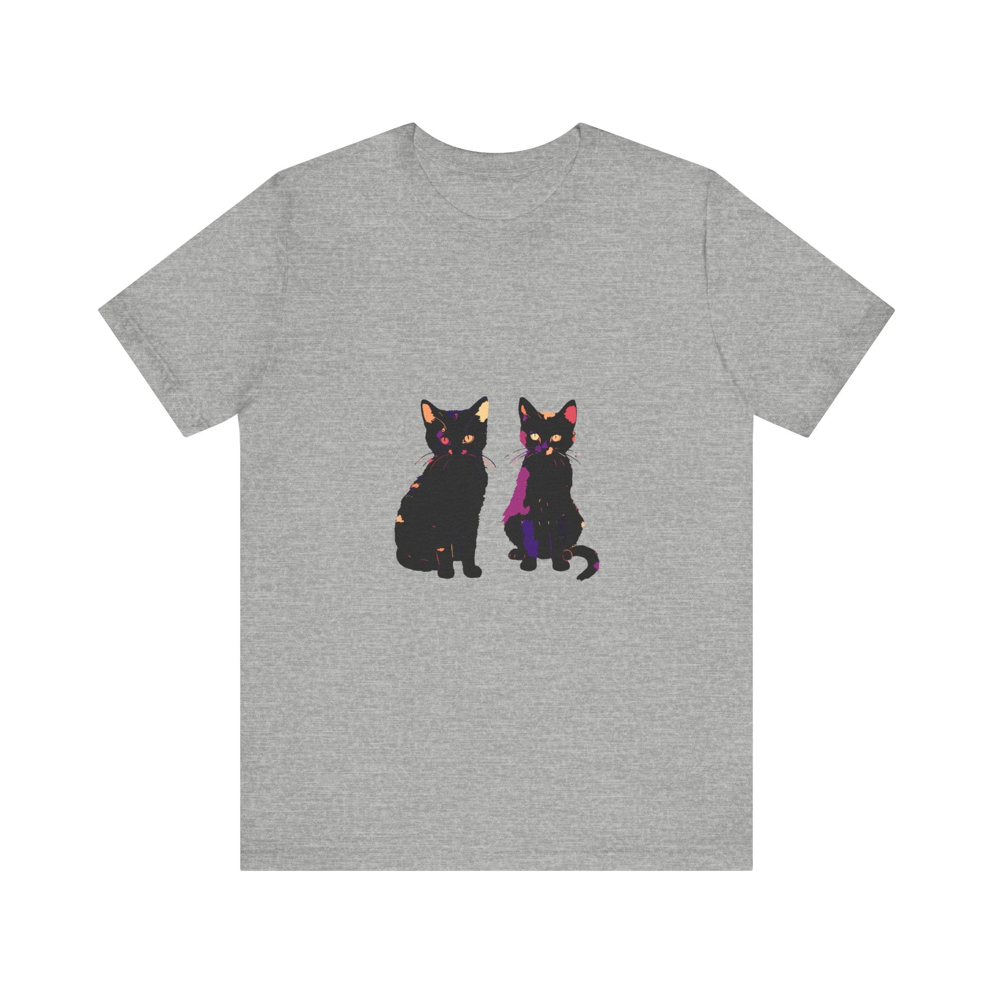 Step into a world where vibrant feline charm meets artistic expression with this captivating t-shirt. Adorned with two enchanting black cats, each illustrated with playful colors against a rich backdrop, this shirt transforms everyday attire into a whimsical canvas that radiates personality and creativity.