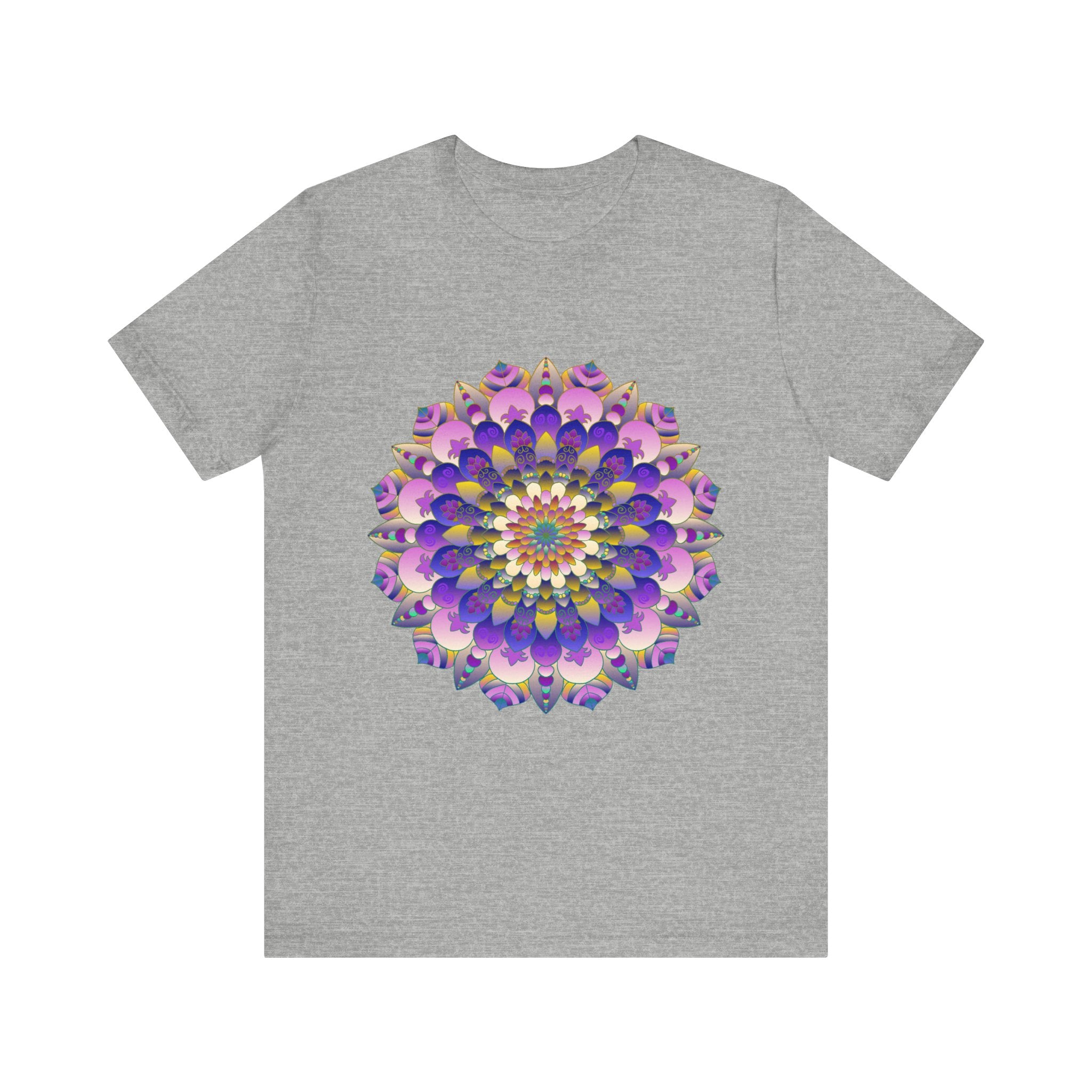 Bold and mesmerizing, this t-shirt showcases a vibrant mandala flower design that draws you into a world of color and spirituality. Each intricate petal and geometric shape bursts with hues of purple and gold, radiating positivity and energy. Whether you're dressed for a casual day out or a mindful gathering, this piece transforms your look into an expression of your artistic soul.