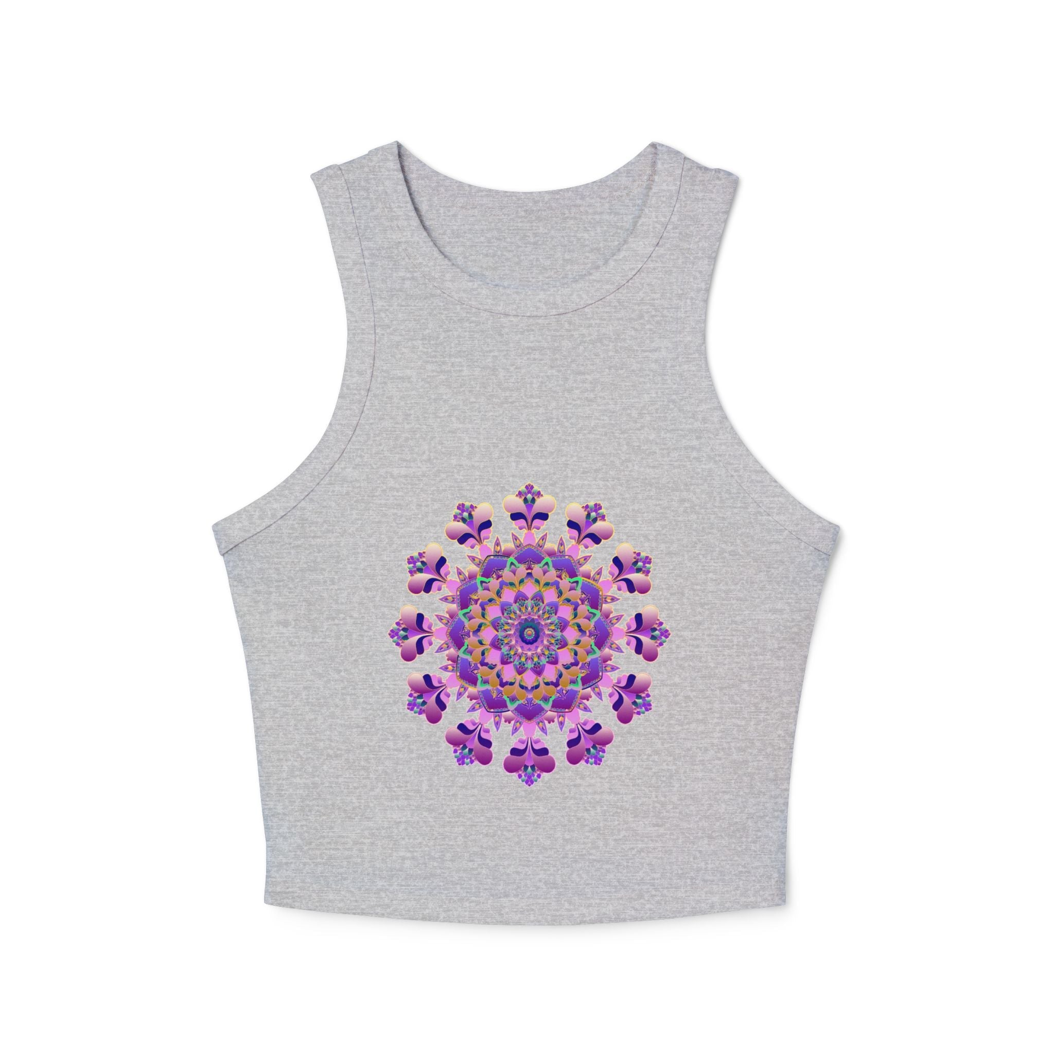 Embrace the enchanting allure of a floral mandala, beautifully illustrated in vibrant hues of purple against a soft gray backdrop. This stunning tank top captures the essence of nature's intricate beauty, inviting you to express your individuality and creativity. The mesmerizing design evokes a sense of calm and mindfulness, making it the perfect addition to your wardrobe for any occasion.