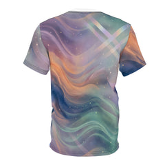 This Unisex All over Print T-shirt radiates feline energy. It feels warm yet otherworldly. Rays of light emanate upward and outward, creating a serene, celestial mood. Inspired by sacred geometry and contemporary digital art. Symbolism: inner peace, awakening, and balance through color harmony and serene posture.
