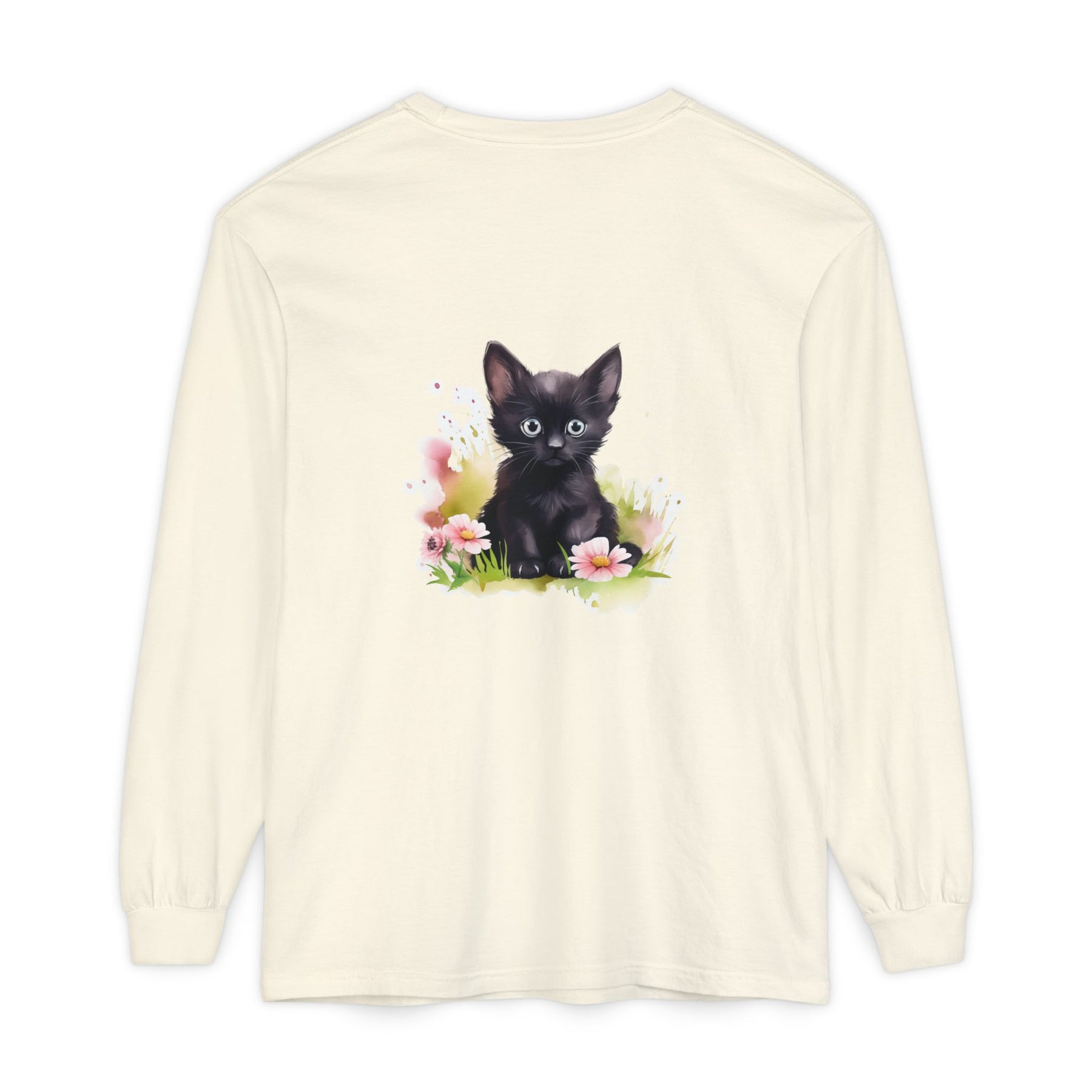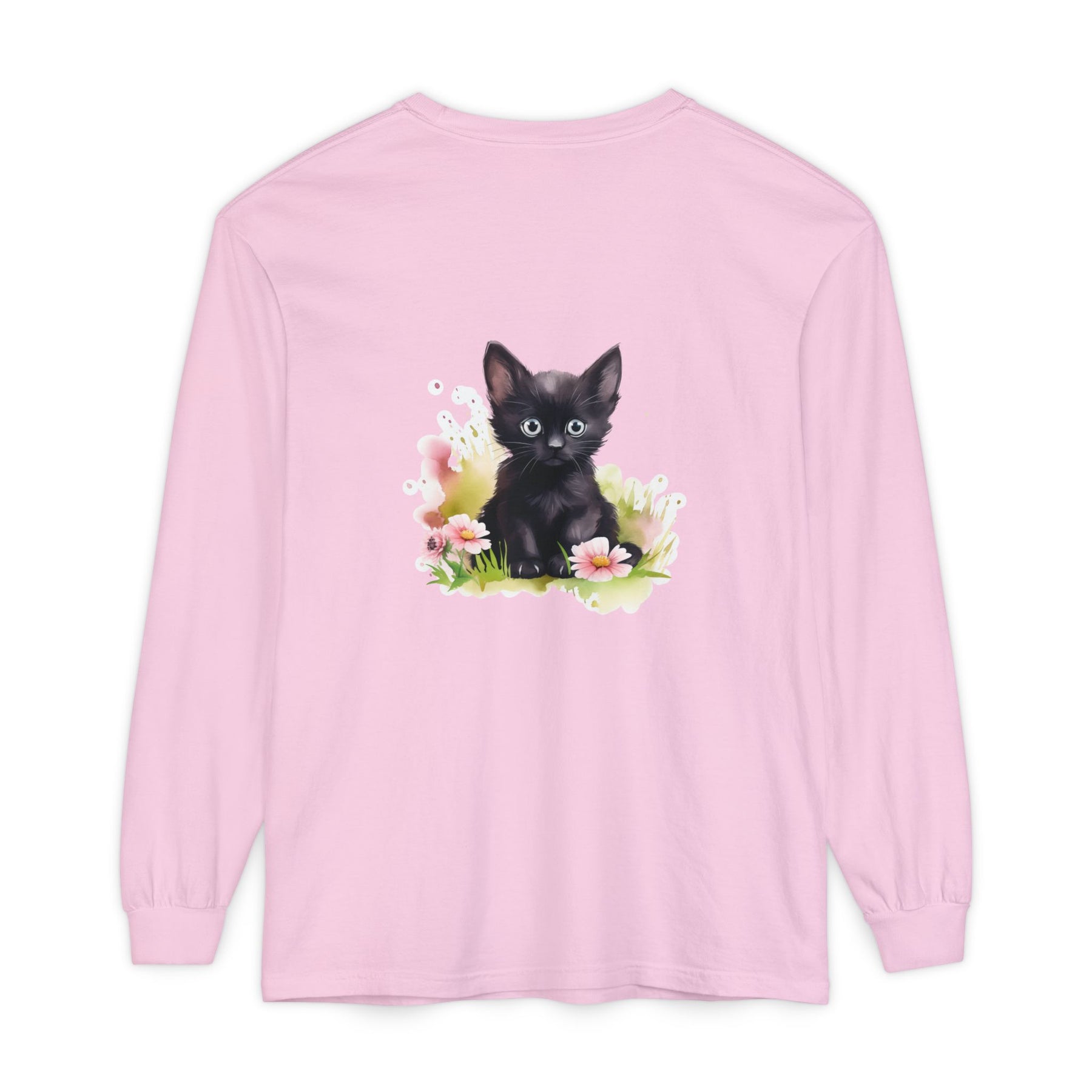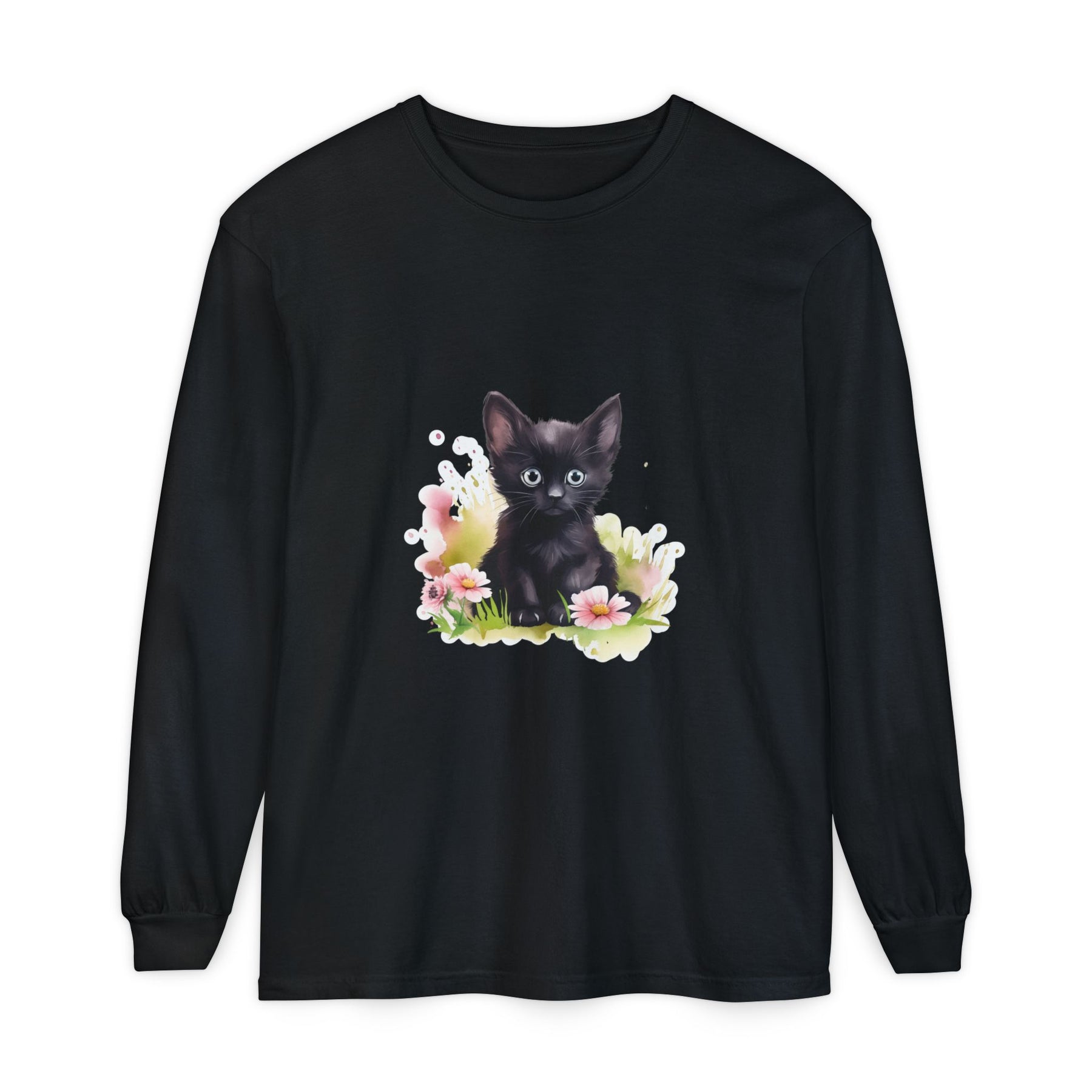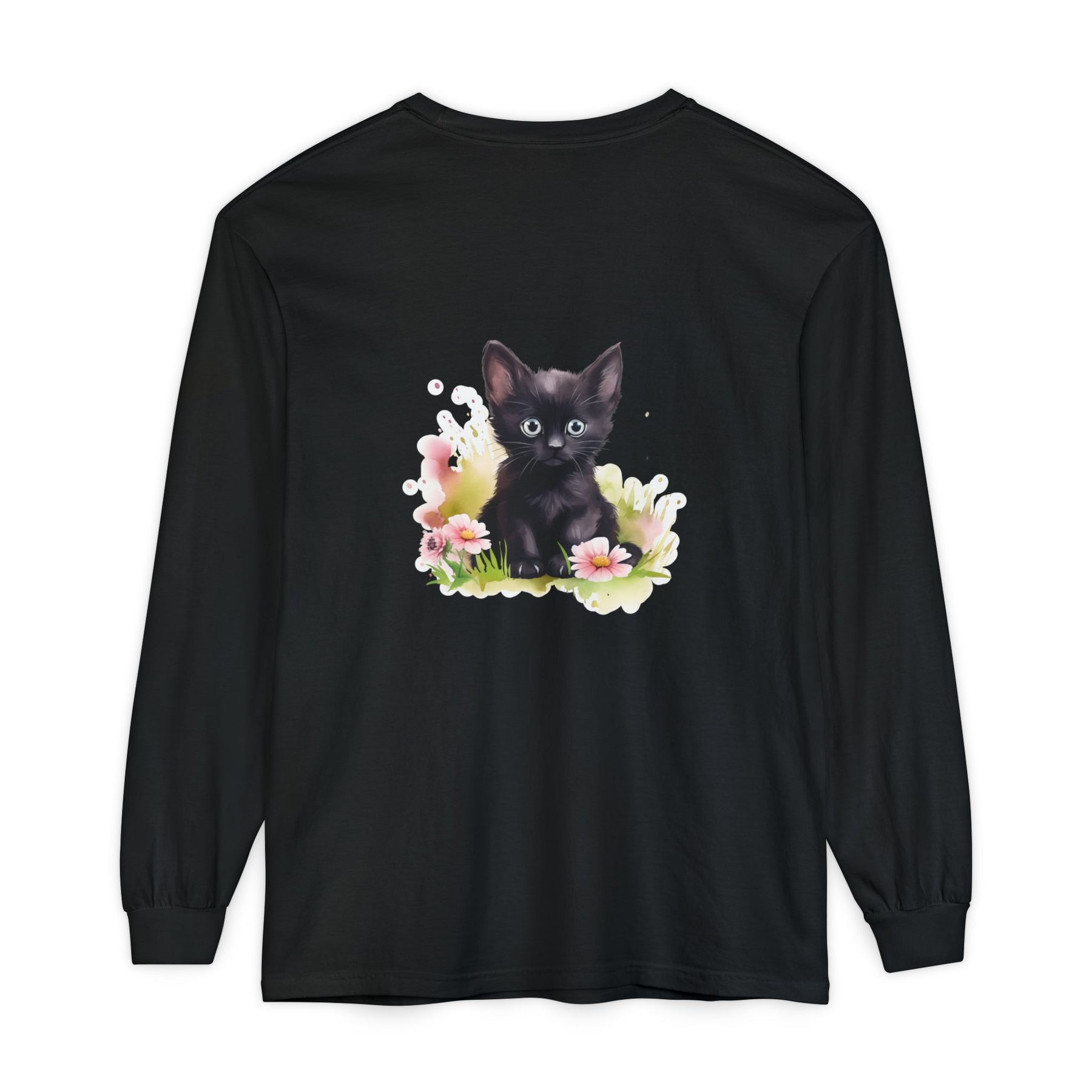 This adorable long-sleeve tee features a charming black kitten nestled among pink flowers. A whimsical design perfect for cat lovers and nature enthusiasts alike.