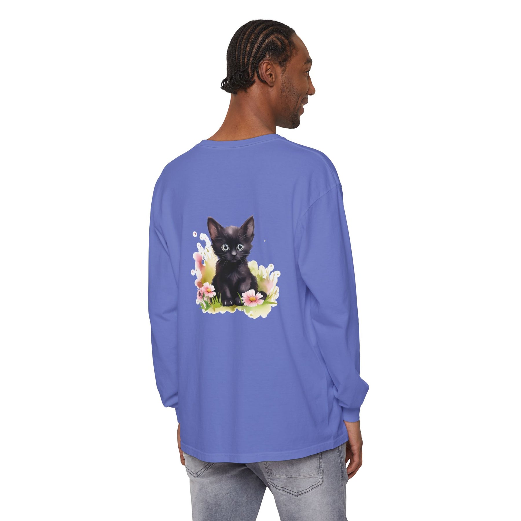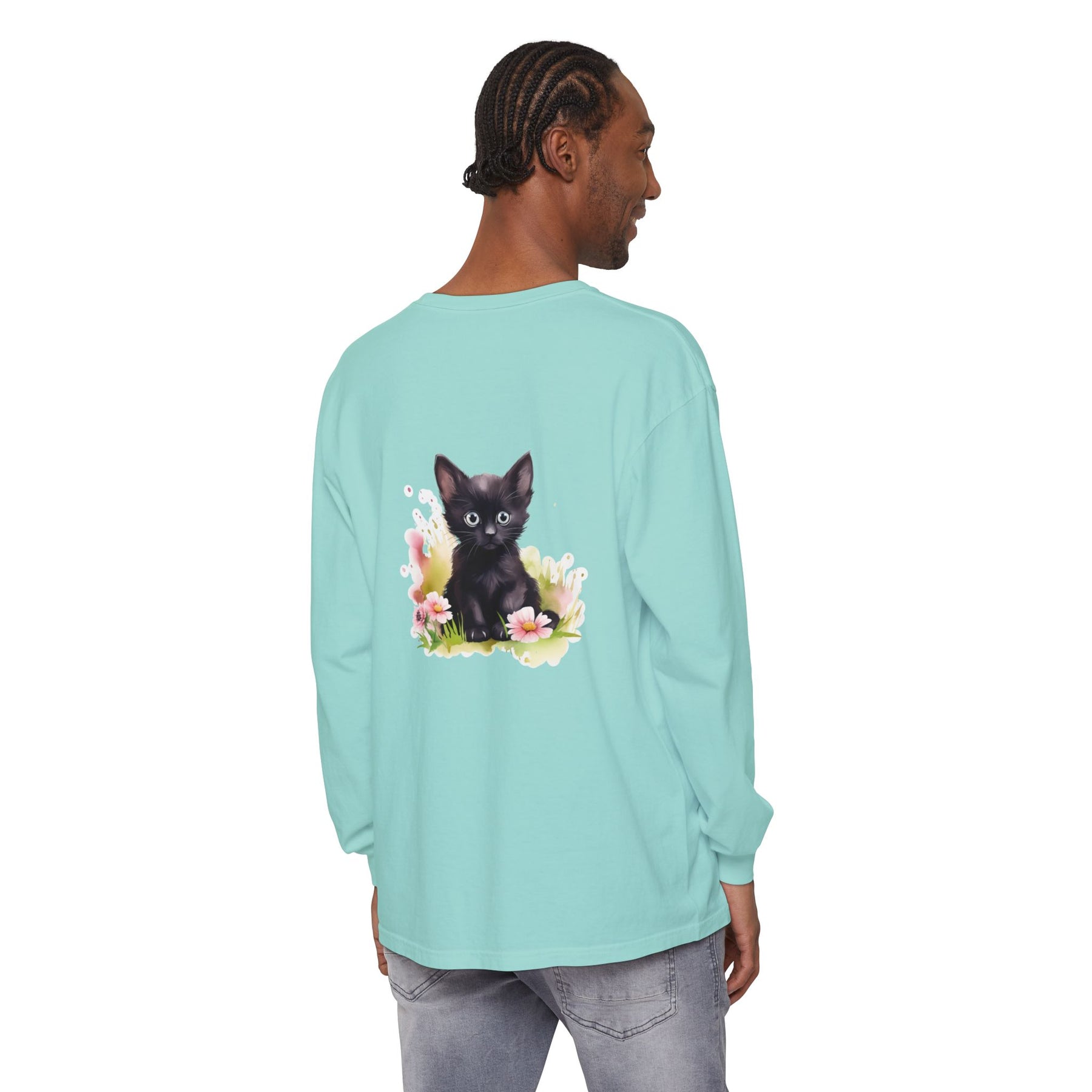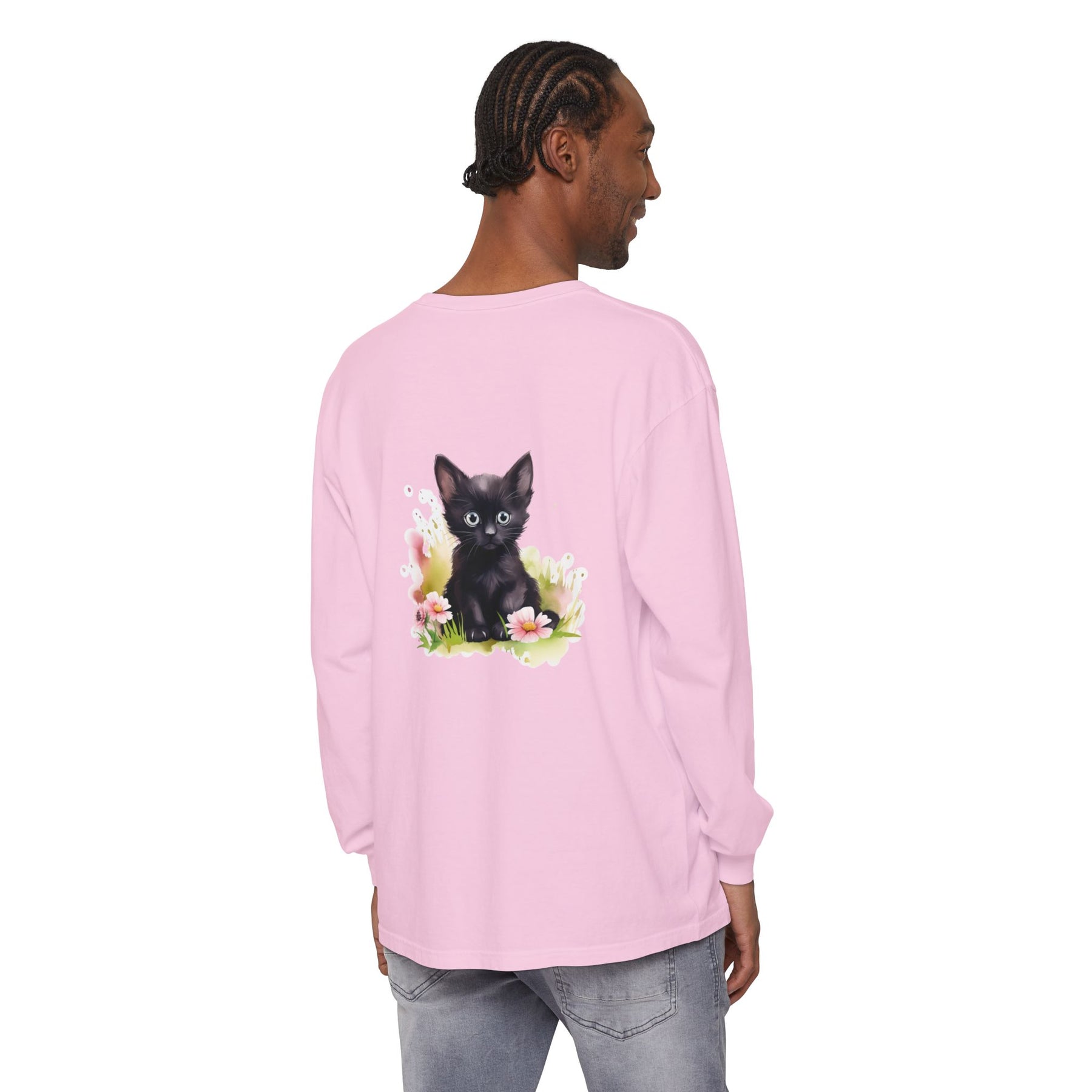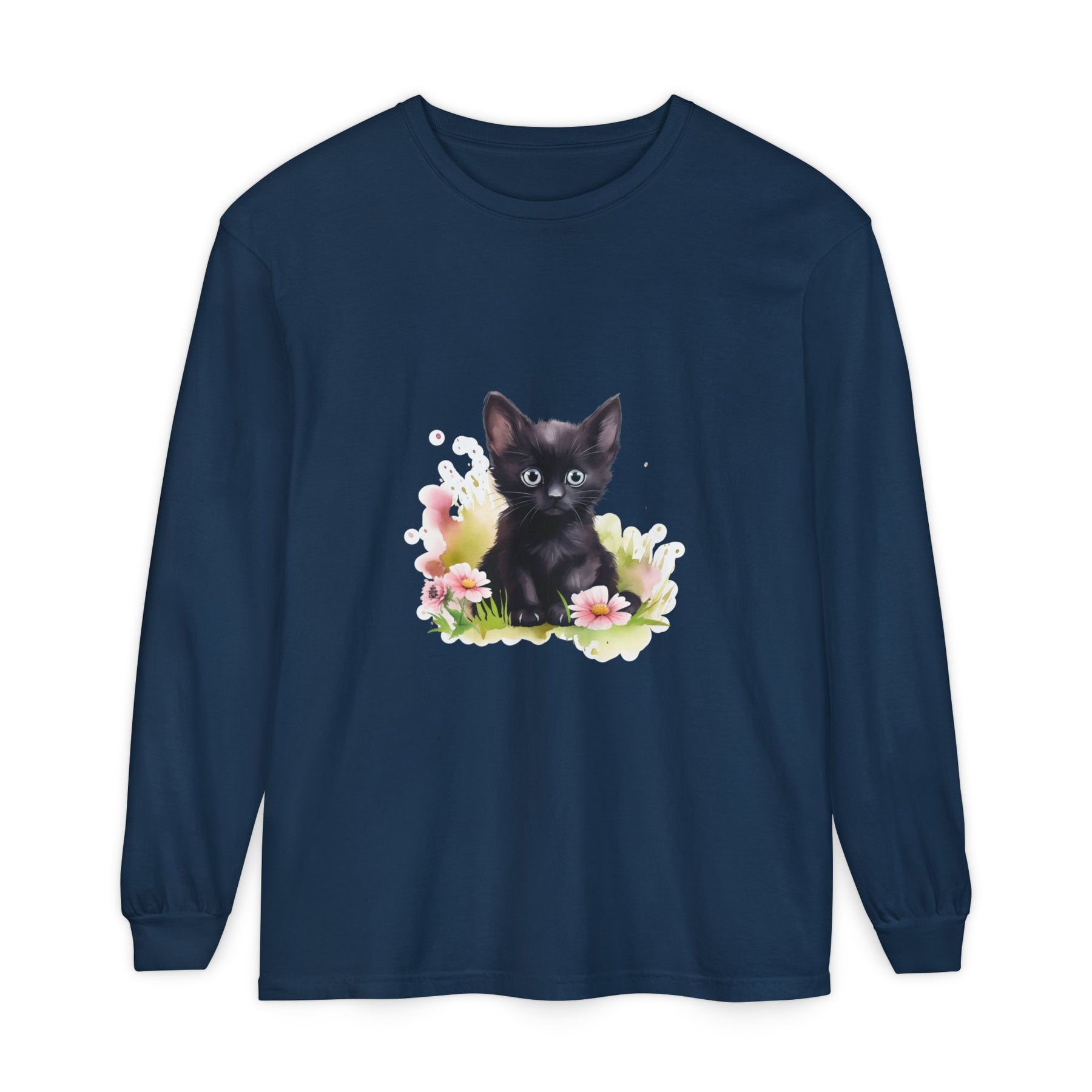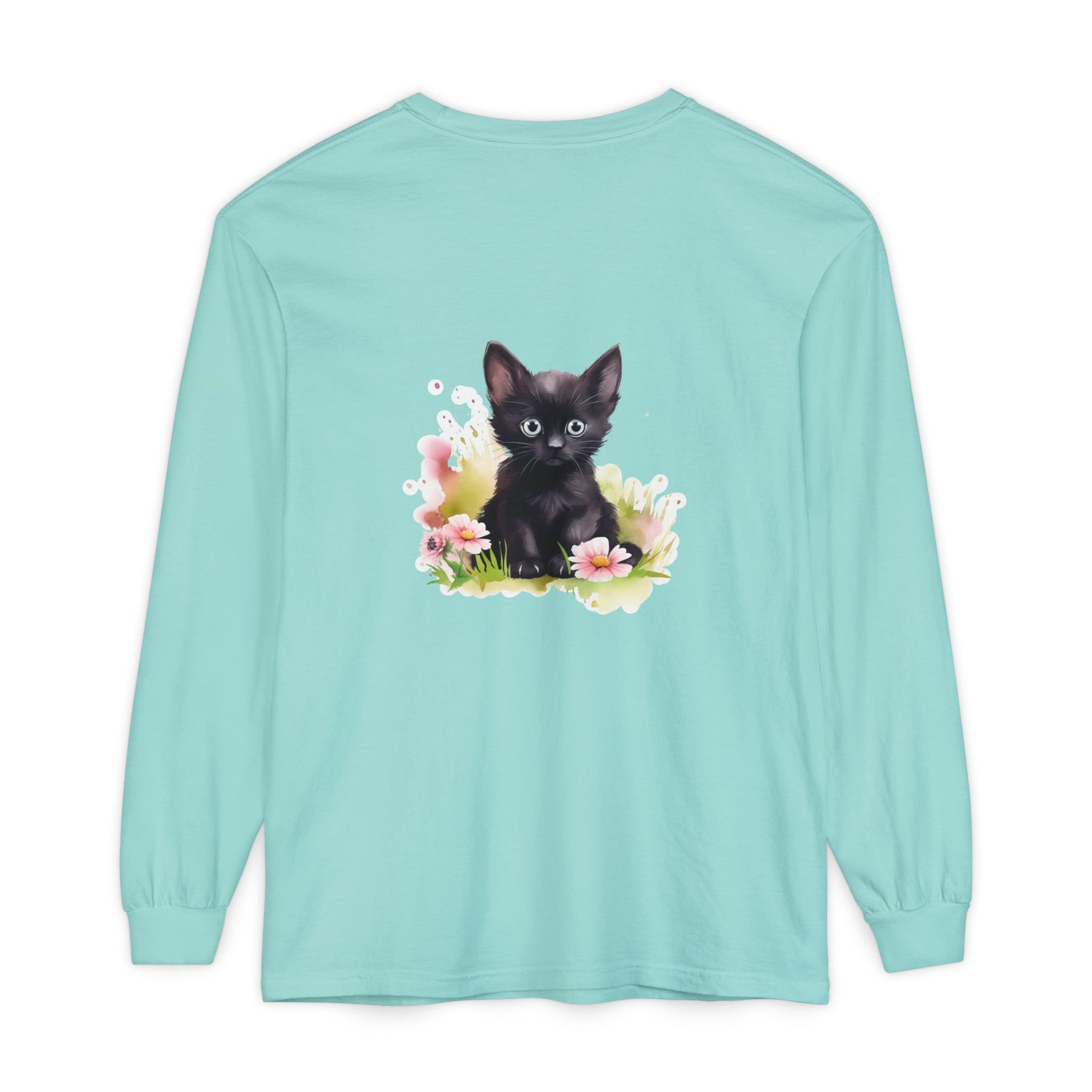 This adorable long-sleeve tee features a charming black kitten nestled among pink flowers. A whimsical design perfect for cat lovers and nature enthusiasts alike.