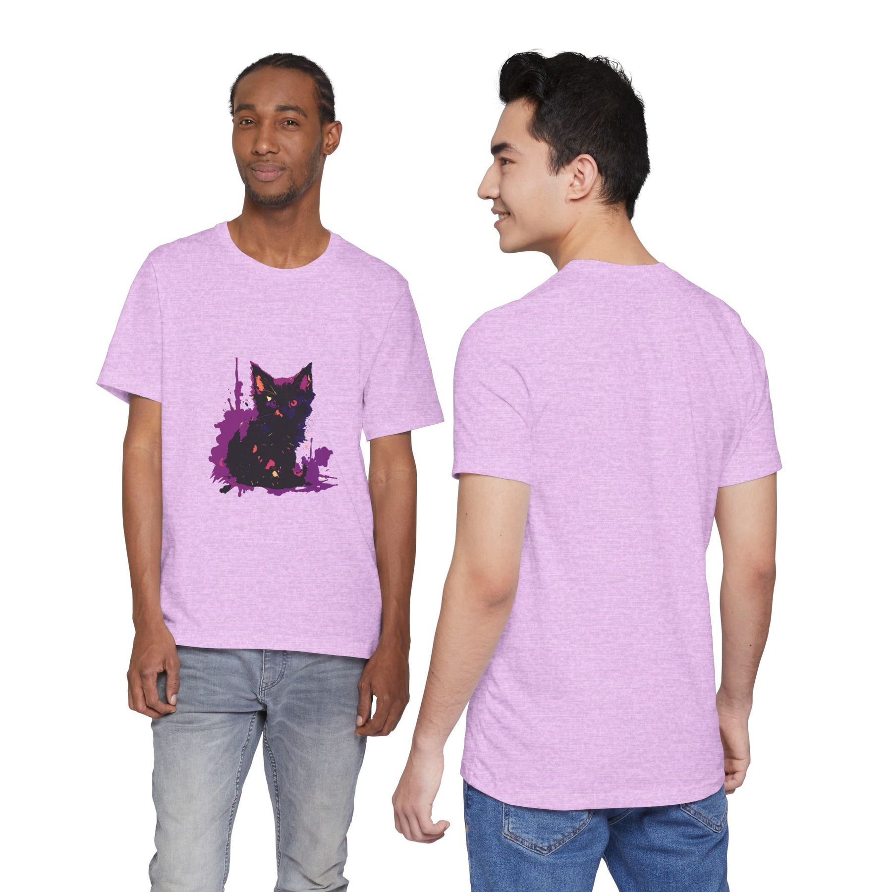 Dieses originelle T-Shirt zeigt eine schwarze Katze inmitten leuchtend violetter Farbspritzer. Ein verspieltes Design für Katzenliebhaber mit einem Hauch von künstlerischem Flair.