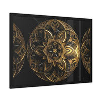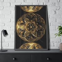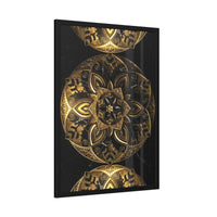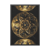 Ein gerahmtes Papierposter, das einem modernen Raum eine tiefe, antike Wärme verleiht. Das kunstvolle goldene Mandala schwebt auf einem satten schwarzen Hintergrund, seine geschnitzten Details fangen das Licht ein wie ein Relikt, das aus einem Atelier der alten Welt geborgen wurde. Untergebracht in einem mattschwarzen Kiefernholzrahmen mit bruchsicherem Plexiglas, wirkt dieses Stück wie ein kuratiertes Stück Geschichte – ruhig, kühn und unaufdringlich luxuriös. Hängen Sie es über eine Konsole, um einen Eingangsbereich zu akzentuieren, kombinieren Sie es mit strukturierten Textilien in einem Wohnzimmer, oder lassen Sie es zum kontemplativen Mittelpunkt eines Arbeitszimmers werden. Die Wahl zwischen Kunstdruckpapier und seidenmattem Fotopapier ermöglicht es Ihnen, das Finish abzustimmen: strukturierte Tiefe oder gestochen scharfe, leuchtende Farben. Durchdachte Hardware und Gummistopper machen die Installation mühelos, sodass das Bild vom ersten Moment an perfekt an Ihrer Wand sitzt.