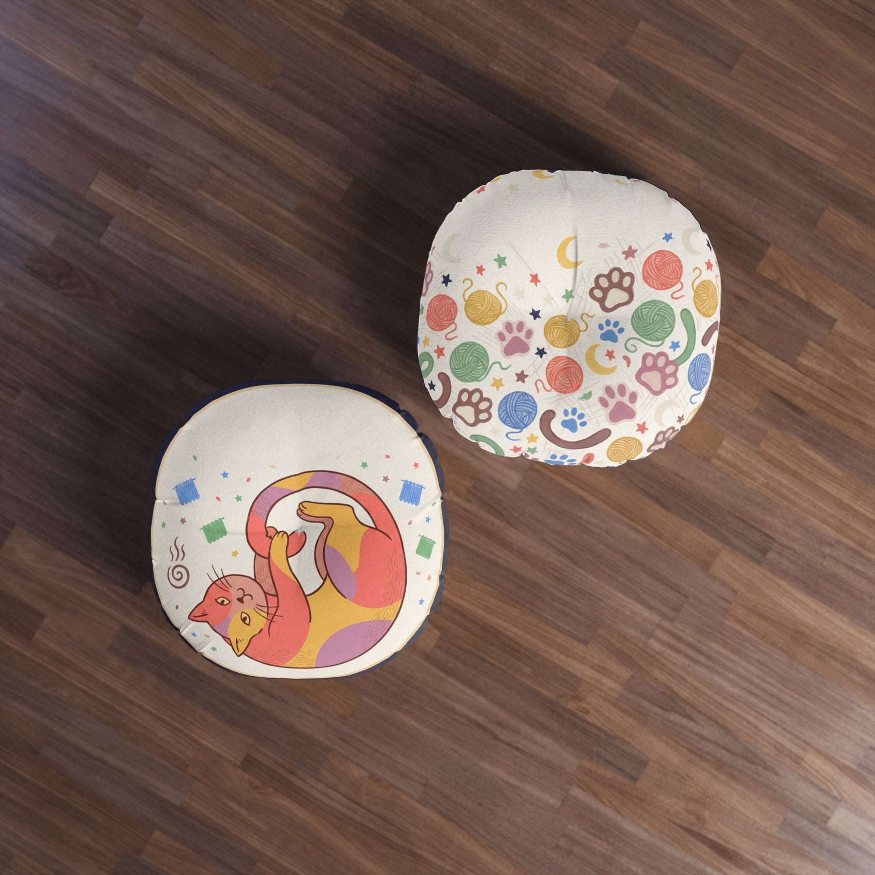 Round tufted cat floor pillow with Cozy Winter / New Year Boho Cat design in warm pink, yellow, and teal; lifestyle shot on a living room floor showing a relaxed, cozy setup.