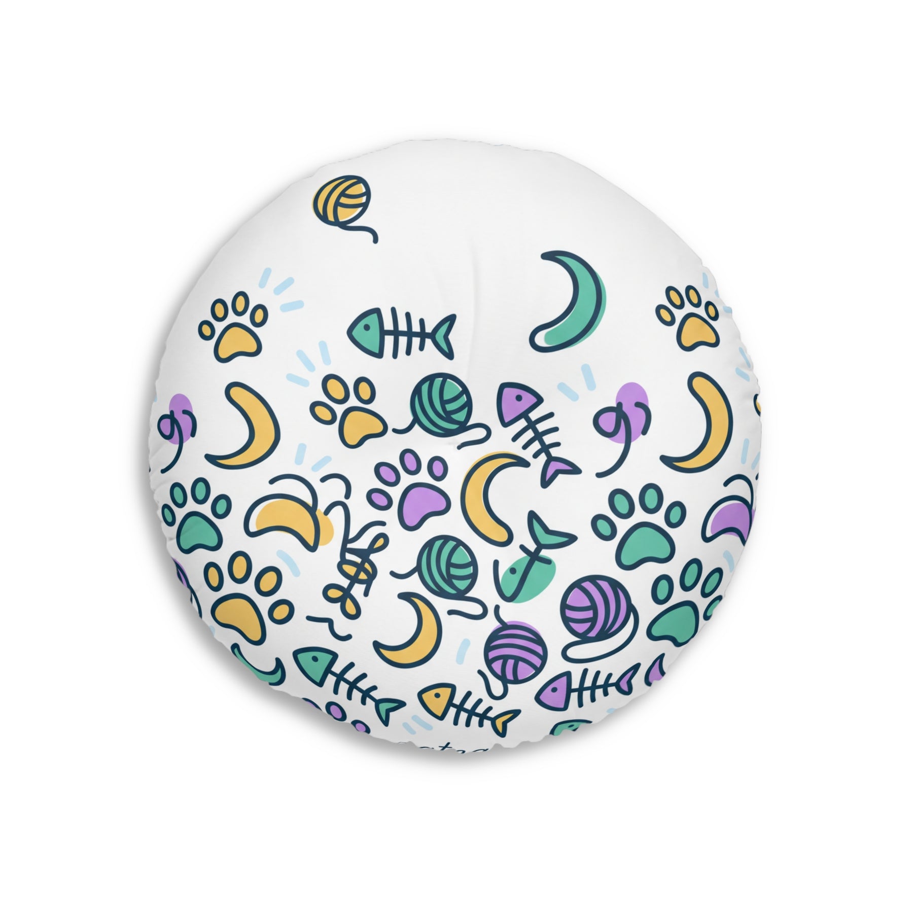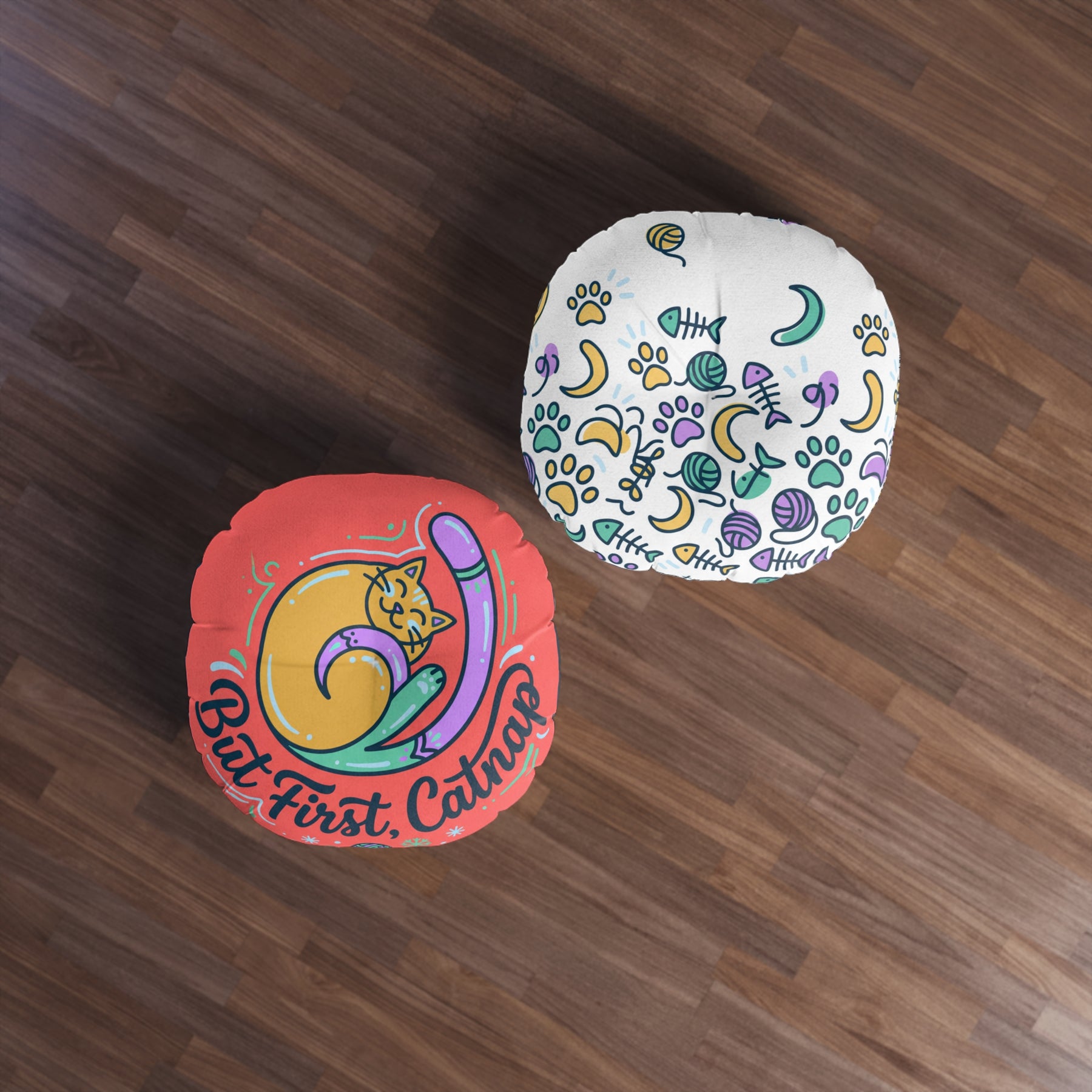 Round tufted floor pillow in warm coral (#FF6B6B) and mint surrounding a curled cat line-art design; lifestyle shot showing cozy winter interior with the cat-inspired cushion.