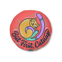 Stellt man dieses fröhliche runde Kissen in eine Ecke, wirkt der Raum sofort wärmer und verspielter. Das Motiv mit der zusammengerollten Katze und die leuchtenden Farben laden zum Innehalten und zu einem kurzen Nicker...