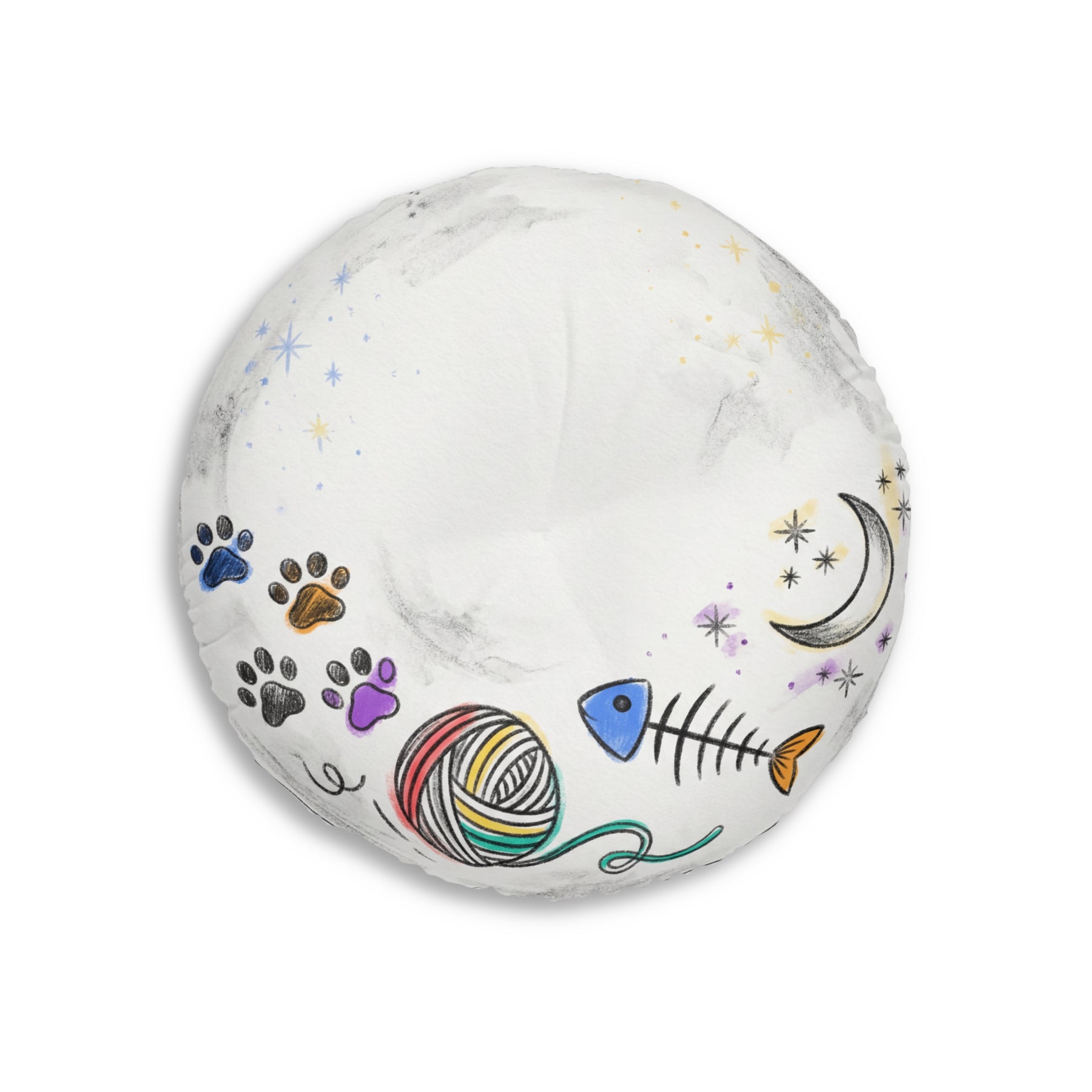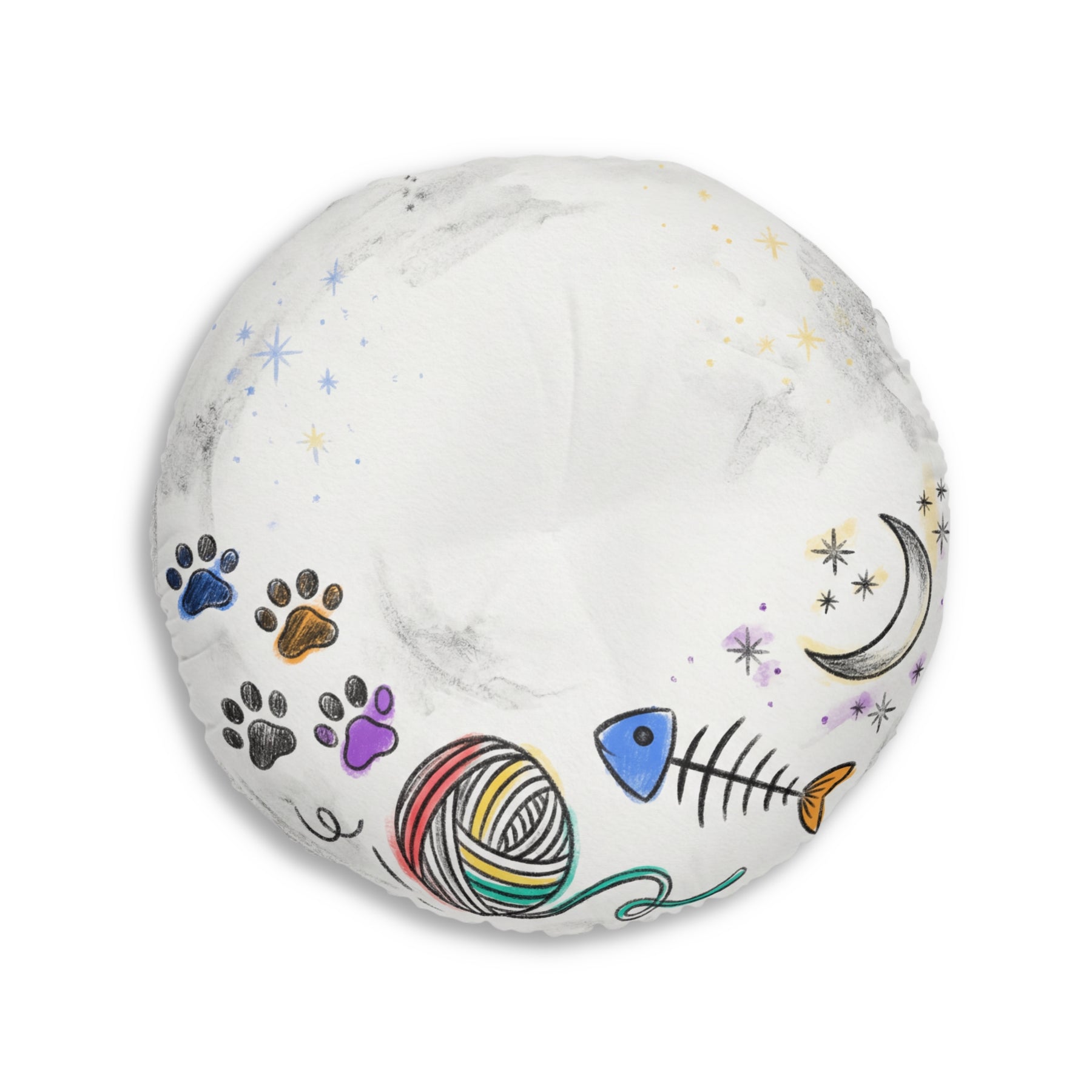 Close-up lifestyle shot of a round tufted floor pillow with bright blue and warm colors, featuring a cute cropped cat line-art in a winter cozy vibe, ideal for a cozy living space. The setting emphasizes comfort and everyday use.