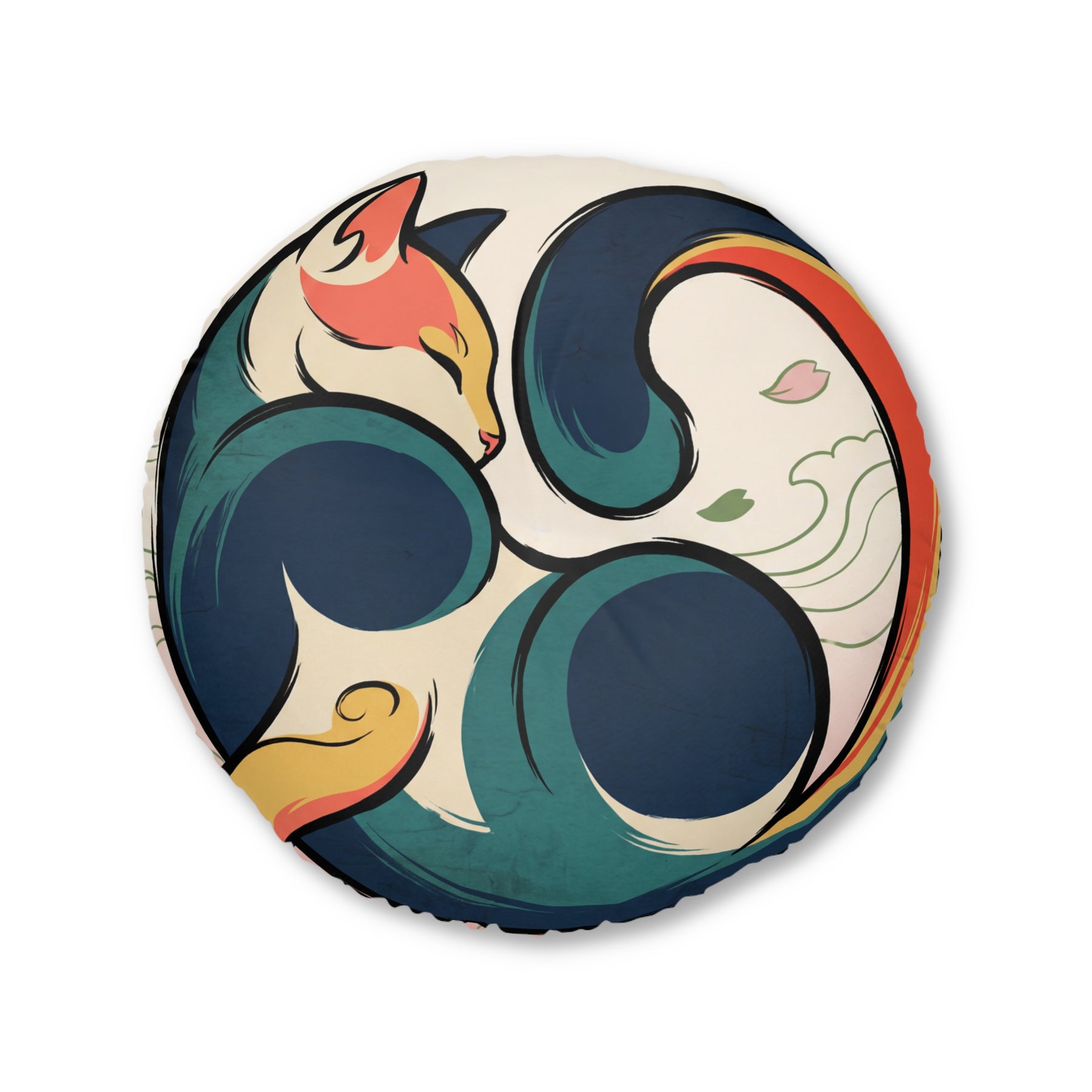 Close-up of a round, tufted floor pillow featuring a New Year cozy cat in teal and warm accents, shown in a cozy living room setting with texture details and a festive vibe. Lifestyle/close-up view for accessibility.