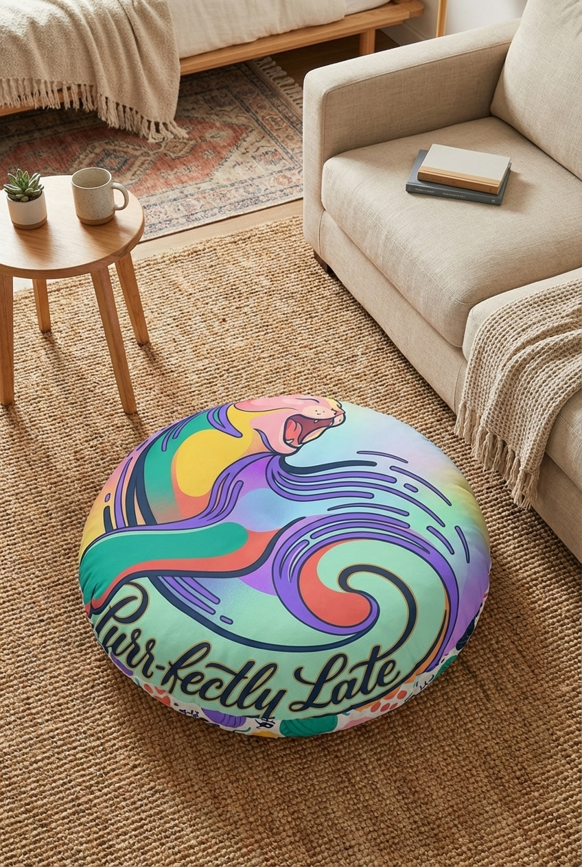 Close-up of a vibrant teal cat-themed round floor pillow with tufted texture and surreal crescent-cat motif; winter/post-New-Year whimsy vibe in a cozy living room setting, lifestyle shot showing a plush, comfortable ambiance.